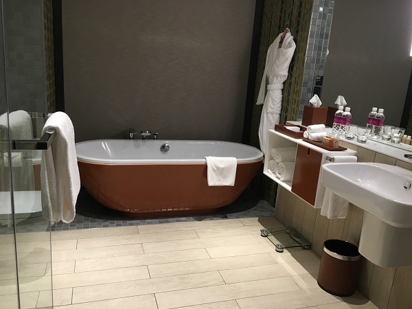 部屋はセーフティボックス、スリッパ、バスローブ、アイロンにアイロン台、湯沸かしポット、無料の水などが用意されていました。バスルームエリアも広く快適に過ごせました。