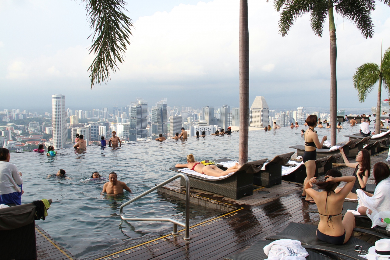 最上階のプールからの眺めは言うまでもなく最高。午後は逆光になるので、プールの写真は撮りづらい。利用者がかなり多く、ベンチを確保するのが大変。利用者の多さ故か、プールの水は濁り気味で、少しいろいろ浮いている。(潜らない限りは気にならないが)