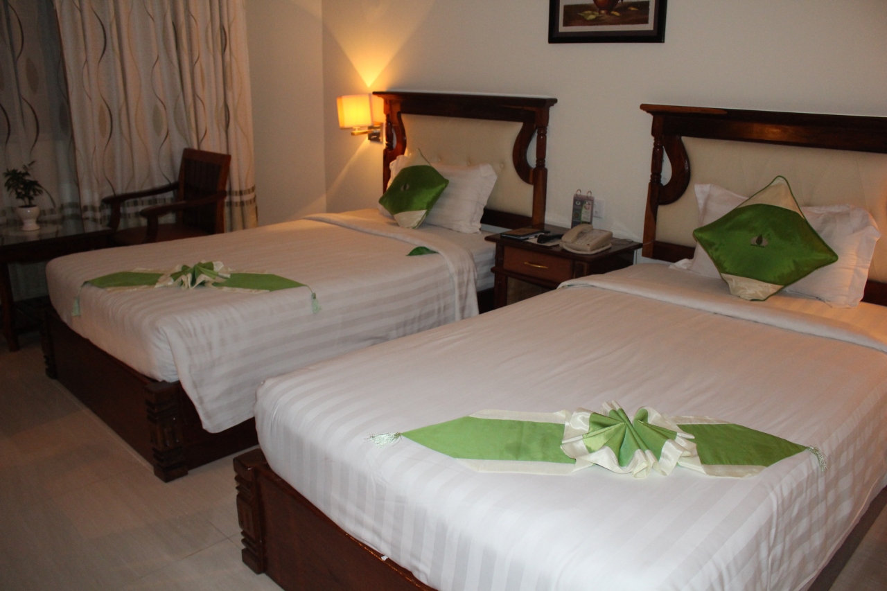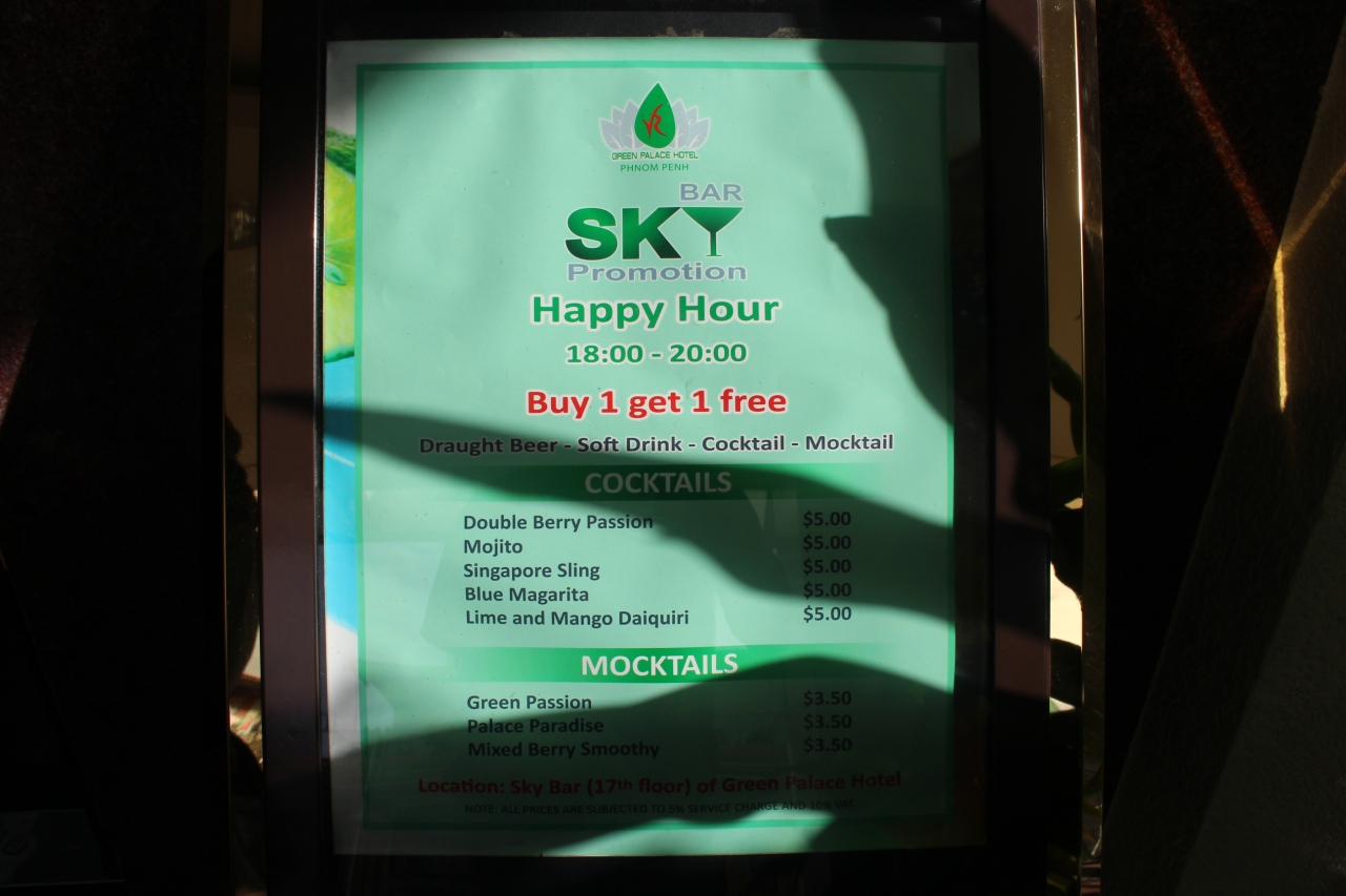 朝食は品数も多く、その場で調理してくれる卵料理や麺料理がおいしかったです。屋上にSKY BARがあり8時まではHAPPY HOURということでビールが1杯タダになるというのでいってみました。お客さんは後から来た欧米系の老夫婦のみ。夜景もバンコクやサイゴンのような華やかなものではなかったですが、風が心地よかったです。