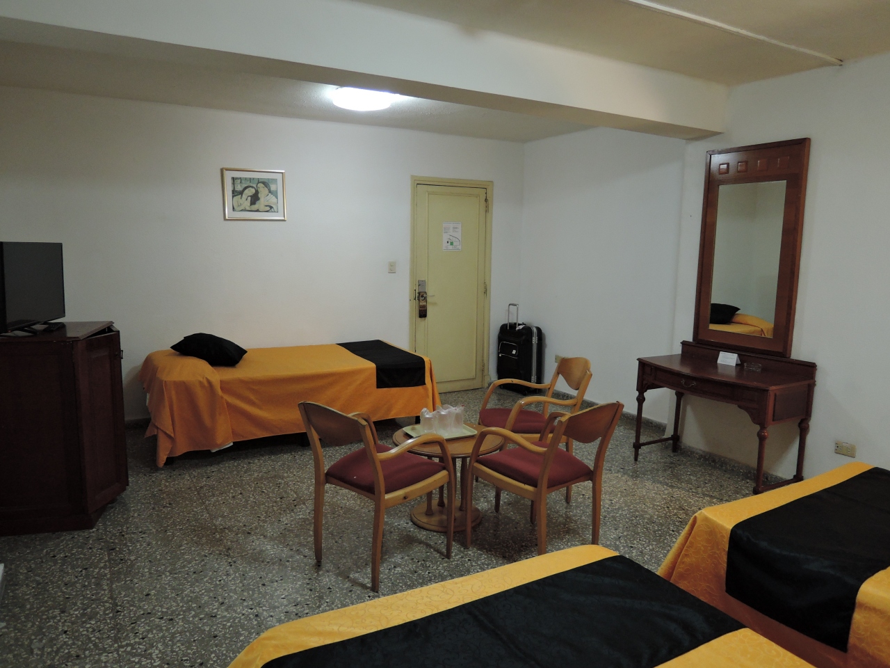 泊まった部屋はベットが3つあるかなり広い部屋だった。12階の部屋で窓から海岸とプンタ要塞が見えた。クローゼットにハンガーがたくさんあり、引き出しもあった。浴室はシャワーのみ。お湯が出るまで3分ぐらいかかる。シャワーカーテンだったが、水漏れは全然しなかった。排水は問題なし。ただ、地面の傾きのためか水が溜まるところがあった。朝食はバイキング形式で種類は豊富だが、味は普通。混み合うと入口で待たされ、相席になる。エレベーター2台のうち1台は故障中で1台しか稼働してなかった。混雑時、乗るのに5分ぐらい待たされた。毎朝8時ぐらいから工事が始まり、セメント等の資材を運ぶため、1台しかないエレベーターを占拠され、2日連続で食堂のある1階から12階まで階段で登らされた。レセプションの対応は普通。タクシーの予約はレセプションではなく、ホテルの出入口付近にいるセキュリティ担当者が受ける形だった。ホテルはマレコン通り沿いにあり、セントラル公園まで徒歩10分ぐらいの距離。Wi-Fiはこのホテルでは使わず、ETECSAのプリペイドカードを並んで買って、セビージャやアンボス・ムンドス等のホテルで使っていた。