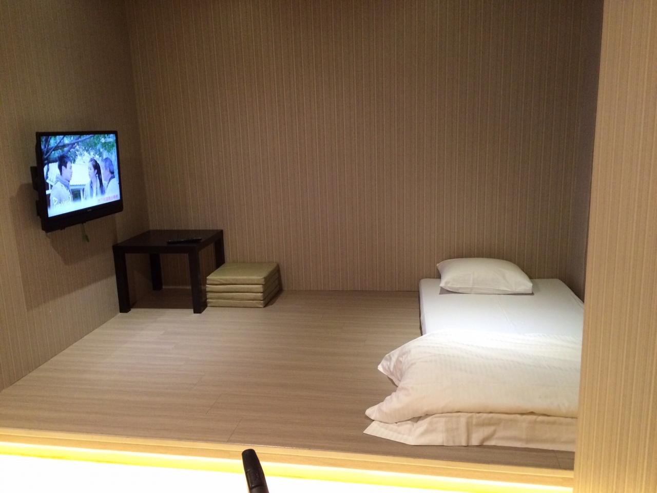 部屋は小部屋があって座布団をひいてくつろげるスペースあり。テレビ2台。使い捨てスリッパ。
