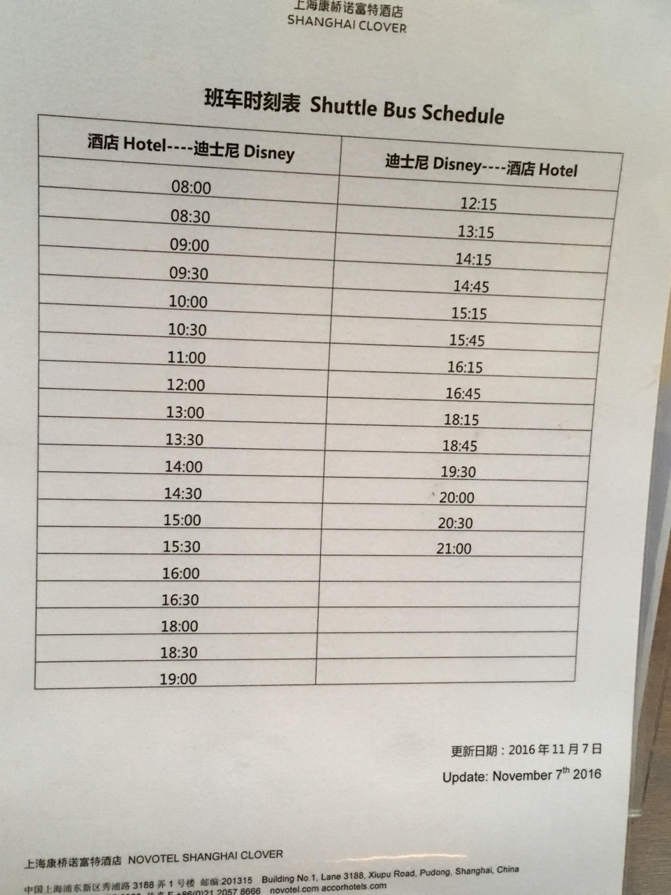 上海ディズニーへは電車で1駅、送迎バスはだいたい30分間隔で走っています。2017年1月現在の送迎バス時刻表を写真にアップしておきます。ディズニーランド駐車所の7番が乗降場所でした。バスに乗車する時、部屋番号を聞かれるので、もしかしたらチェックイン前だと乗せてもらえないかもしれません。