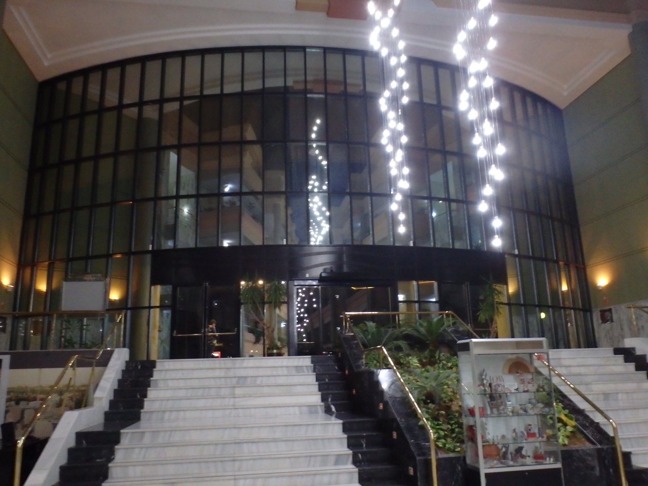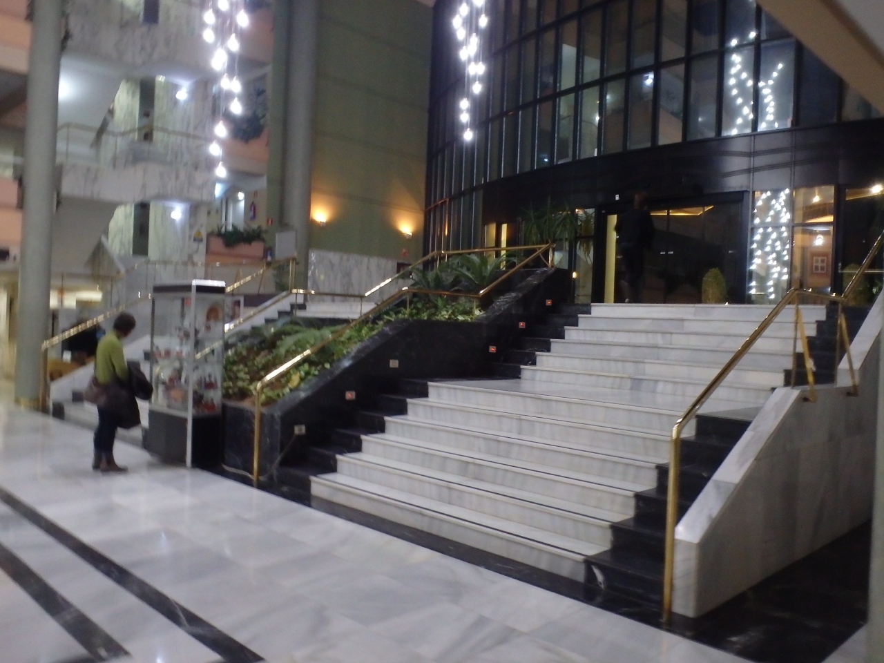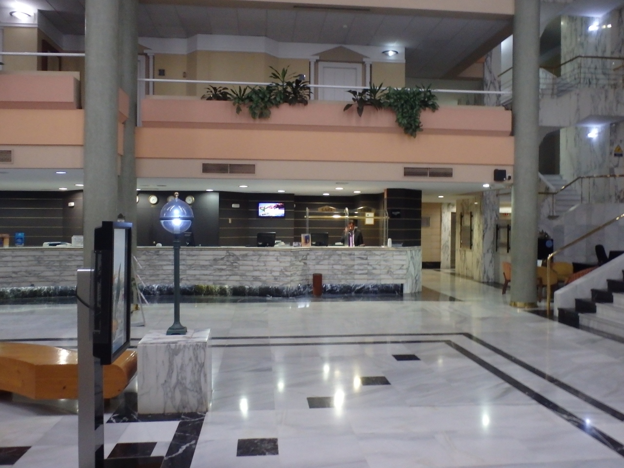 ホテルに入ると12段の下り階段が有りフロントロビーが有ります。スーツーケースがあるとこの階段は大変ですが、階段横には知さなリフトがあり利用することが出来ます。ロビーは凄く広い吹き抜けで大迫力。あまり飾り等はないが東京ディズニーリゾートのホテルを思い出しました。ホテル玄関を出ると正面やや左に大型のスーパーマーケットのカルフールが有り十分買い物を楽します。ただホテルからカルフールまでは近いのですが、行くまでの道路に歩道がなく、また交通量が多いのでちょっと気を付けないと危険です。