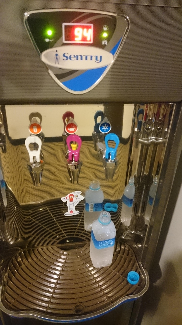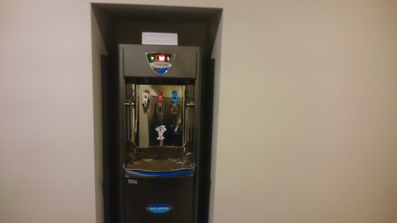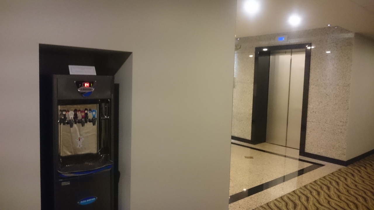 無料のお湯 冷たい水はエレベーター降りて左側の角を覗いてください。私達は10階に宿泊したので1000号室のドアと並んでありました。どの階も同じ位置にあるみたいですよ。遠くから見ただけでは 何の表示もなく不親切な設置方法ですが 夜中水がなくなって ポットや空のペットボトル コップなどを持っていき冷たい水をのみました。