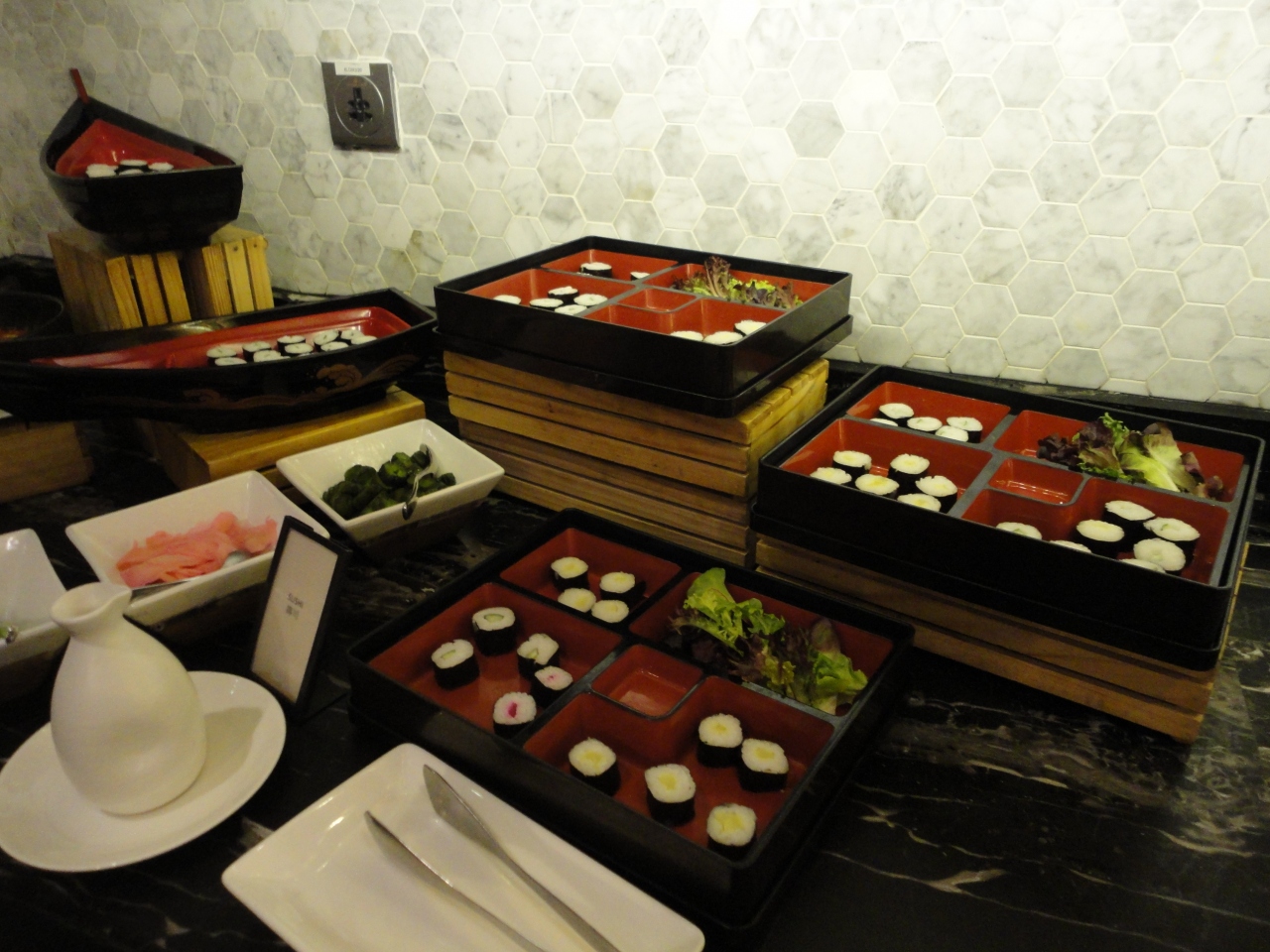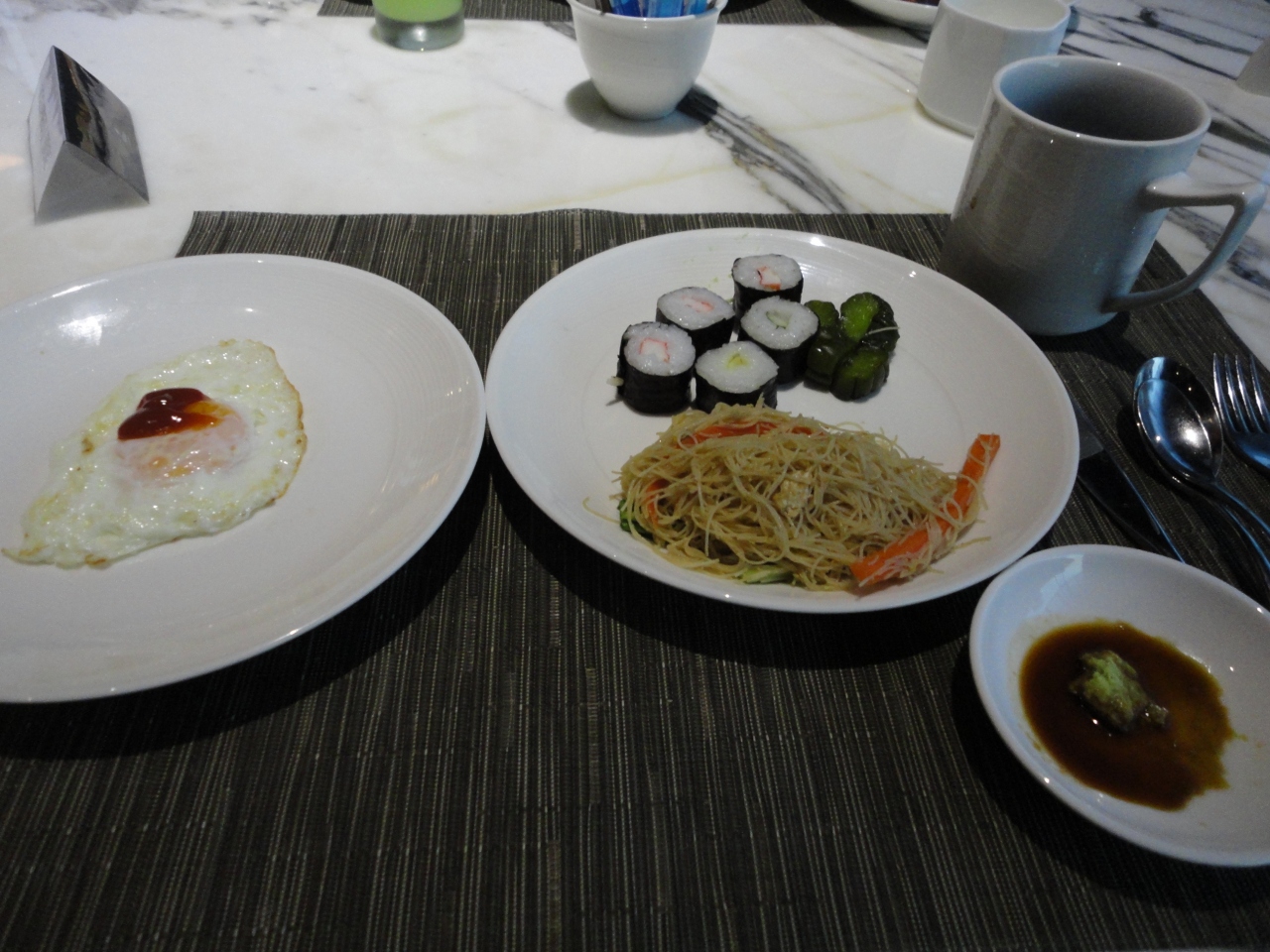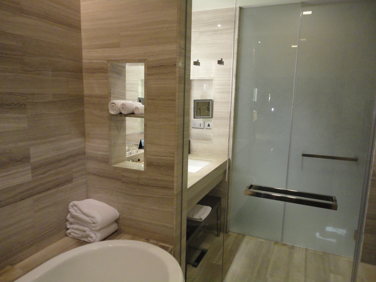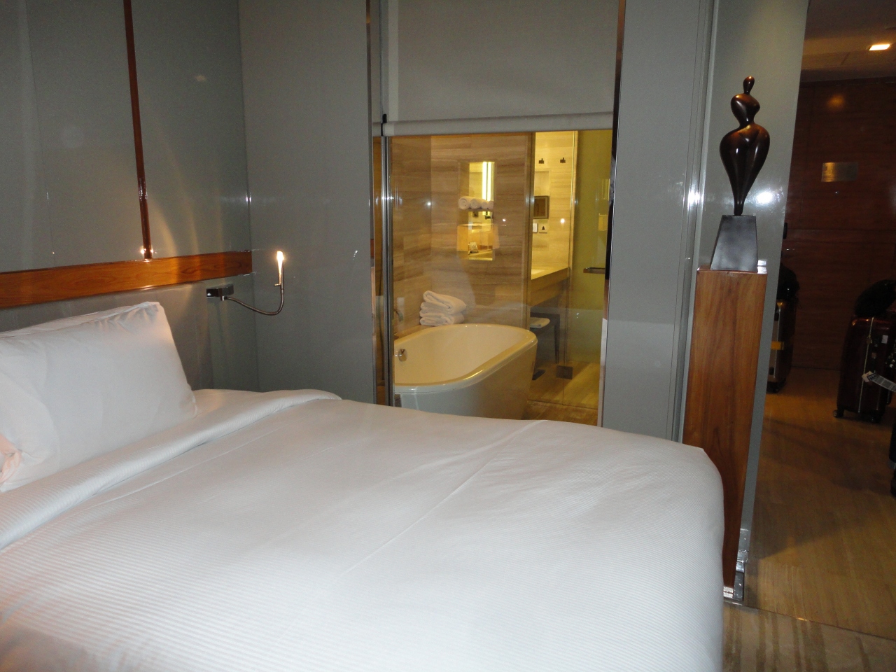 ツアーのホテルランクアップでこのホテルに二連泊しました。豪華なホテルで部屋の家具も快適に使用できます。上階の部屋ということもあり、部屋からの眺めは高層ビルが目立つものの、ずっと奥の方まで見渡せることができます。セミダブルベッドからバスルームが丸見えなのはビックリしました。とてもユニークな造りです。あとでわかったのですが、この部分にはブラインドの上げ下げができるようになっています。ベッドサイドのテーブルにはipod専用のスピーカーがあって、偶然持っていたipodが使えてラッキーでした。クローゼットの前は大きな鏡があって、スタイルチェックができます。ベッドサイドのミニ照明があって読書や携帯チェックが容易にできて重宝しました。バスルームは広くて使い勝手がいいです。バスタブは十分な大きさでゆったりできます。バスタブの外でも自由にシャワーを浴びられて、可動式のシャワーに加えてシーリングシャワーも使えます。裸婦像のオブジェや絵画も飾ってあって、さながらプライベートな美術館にいるような雰囲気です。朝食会場では、席に着くと同時にコーヒーか紅茶を訊かれます。メニューの一番人気はかっぱ巻きとおしんこ巻きです。味噌汁はありますが、よく探してもお椀がなかったのは残念でした。料理の種類が多くて目移りするくらいです。味付けにもかなり注意が払われているようで、どの料理も美味しくいただけました。最後のコーヒーは高級な豆を使っているようで、香り・コク・苦みともバランスがよく取れていました。