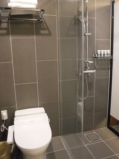 部屋は16階のツインルームで広く、バルコニーからは海や山が綺麗に見えました。トイレはウォシュレット付きですが、バスタブは無くシャワールームのみです。シャンプーはあまり好みの匂いでは無かったです。歯ブラシは無く、ドライヤーも固定です。冷蔵庫は無料の水以外は何も入ってないです。ホテルのテレビの日本語放送はアニマックス?のみで、アニメしか流れてなかったです。朝食のビュッフェは、種類はまあまあですが、翌日もほぼ同じメニューなのが残念です。