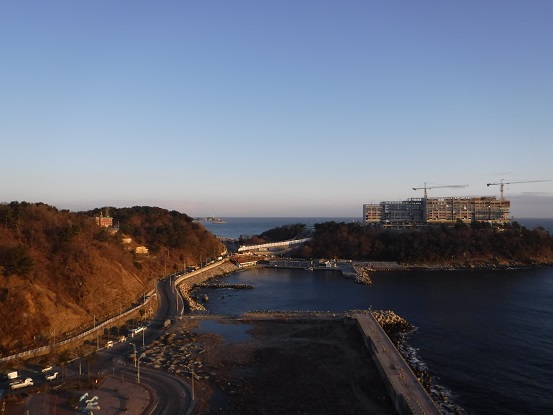このホテルは海岸ギリギリに建っているので、風は強いですが綺麗な景色を楽します。ホテル周辺はコンビニや飲食店、スーパーなどもあり、この地域の他のホテルより便利なようです。タクシーで10分位、5000~6000ウォン程度で、観光地であるアバイ村や束草の市街地に行くこともできます。タクシーはフロントで呼んでもらいました。アバイ村を見たあとも、市街地方面へ行くと流しのタクシーが沢山走ってます。