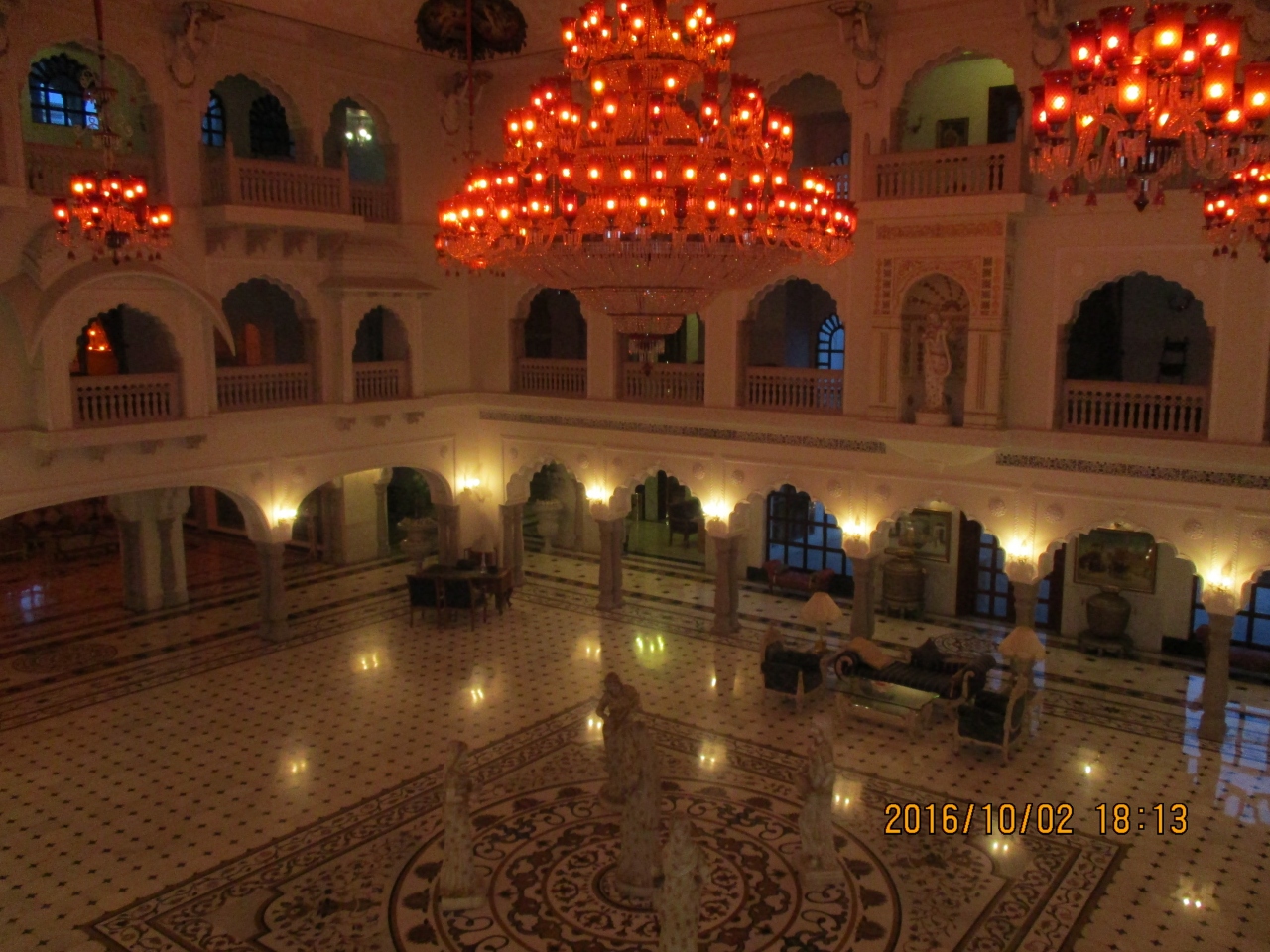 装飾はとても豪華。ホテル正面の庭はかなり広いです。裏にプールがあります。