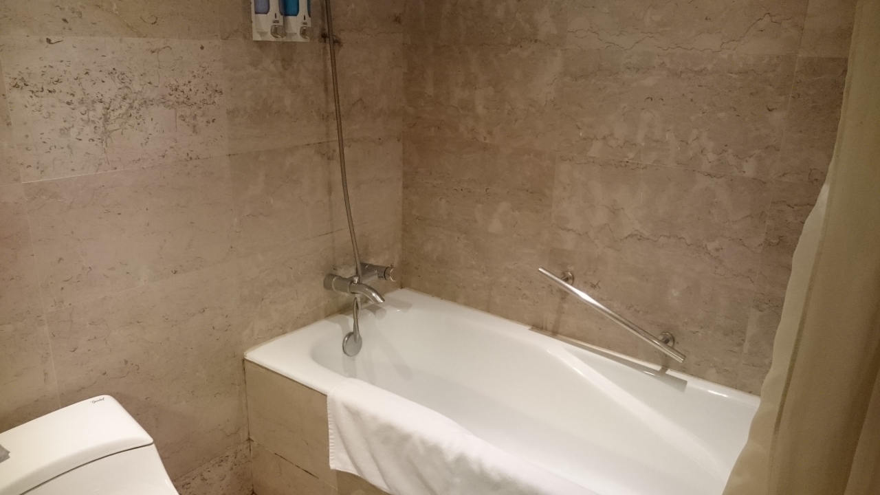 部屋は古いけどベランダやバスタブがあり、コンセントは日本のものがそのまま使え、使い捨てスリッパがあるなどアメニティが揃っていました。