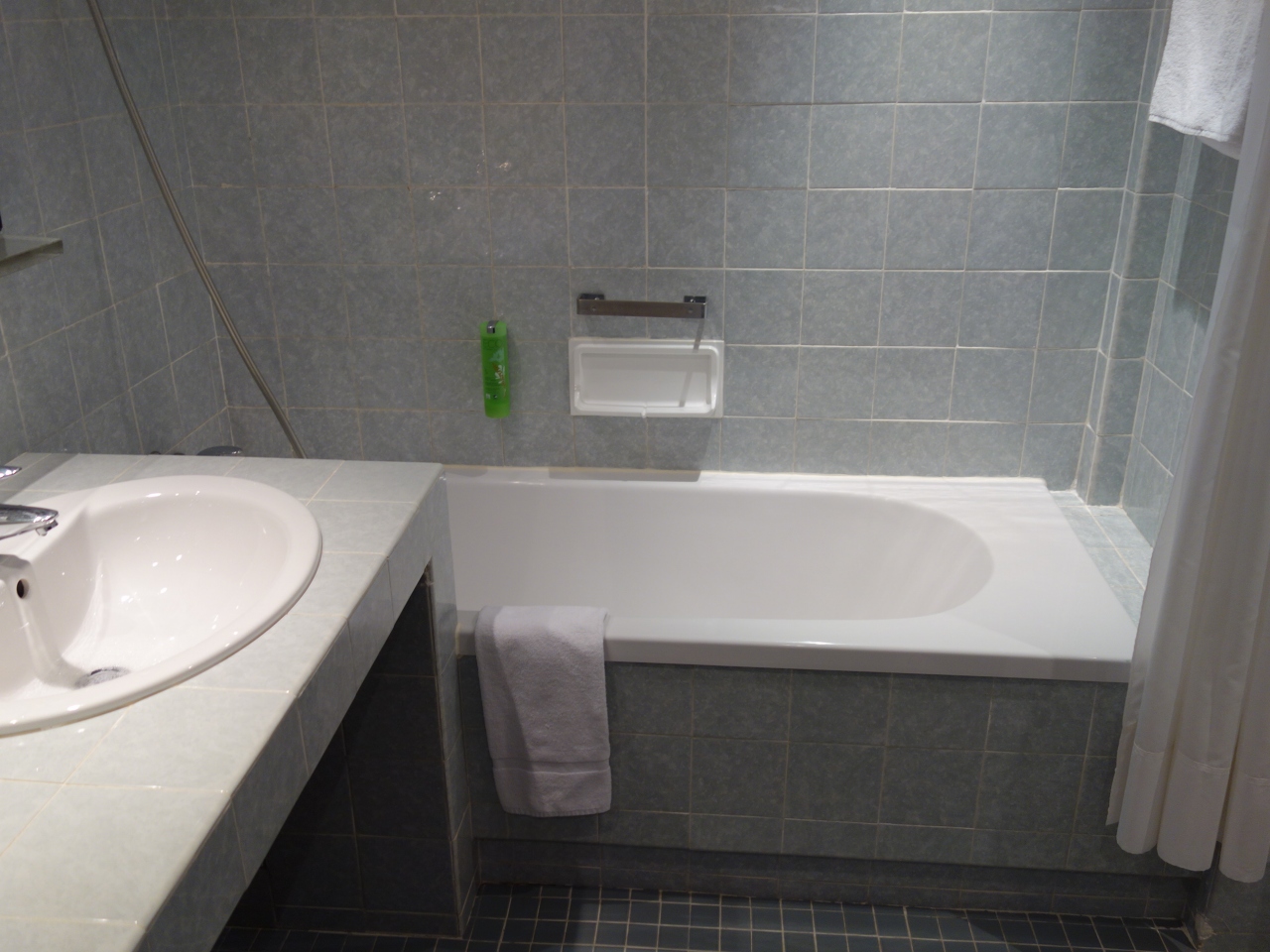 部屋は,都会ですので,とっても広い,というわけではありません。でも,ちゃんとバスタブはあるし,シンクも二つあります。スーツケースを開く余地は十分あるので文句はありません。椅子もあります。電気ポットもあります。冷蔵庫もあります。不足はありません。
