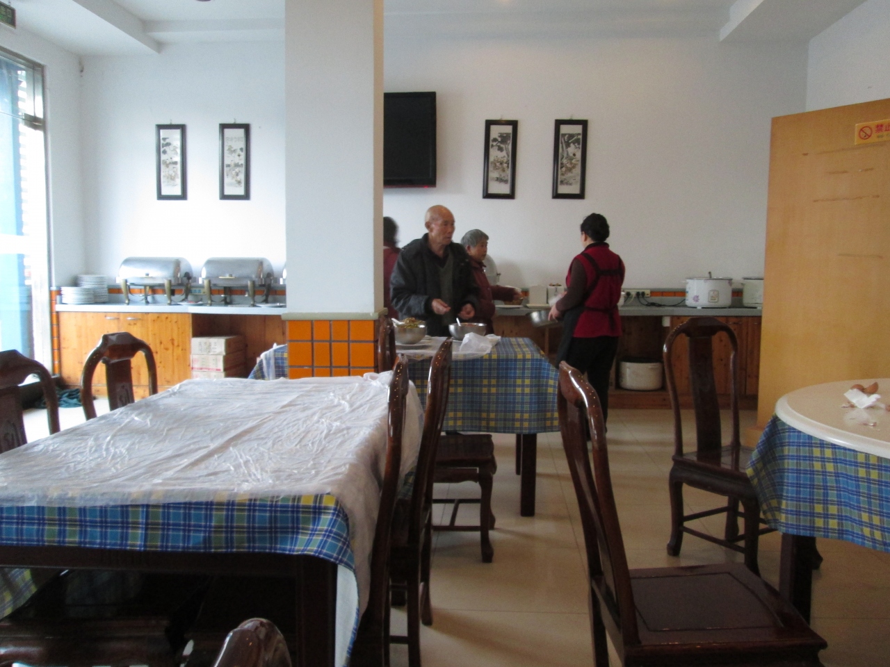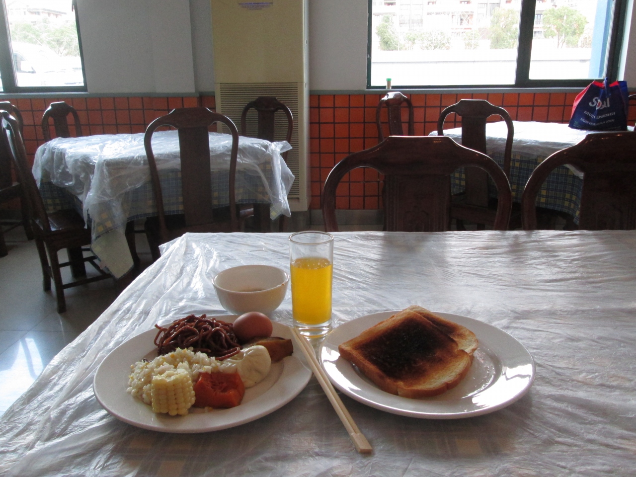 チェックイン時に朝食券は2泊分もらえ、1階の会場で7時から9時の短い時間帯であったが利用できた。2日とも同じメニューで、おそらく、上海の標準的な朝食メニューであまりおいしくなかった。冬季だったかもしれないが、暖かいオレンジジュースが提供されていたのは驚いた。