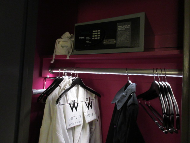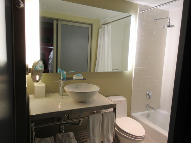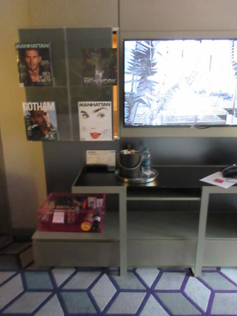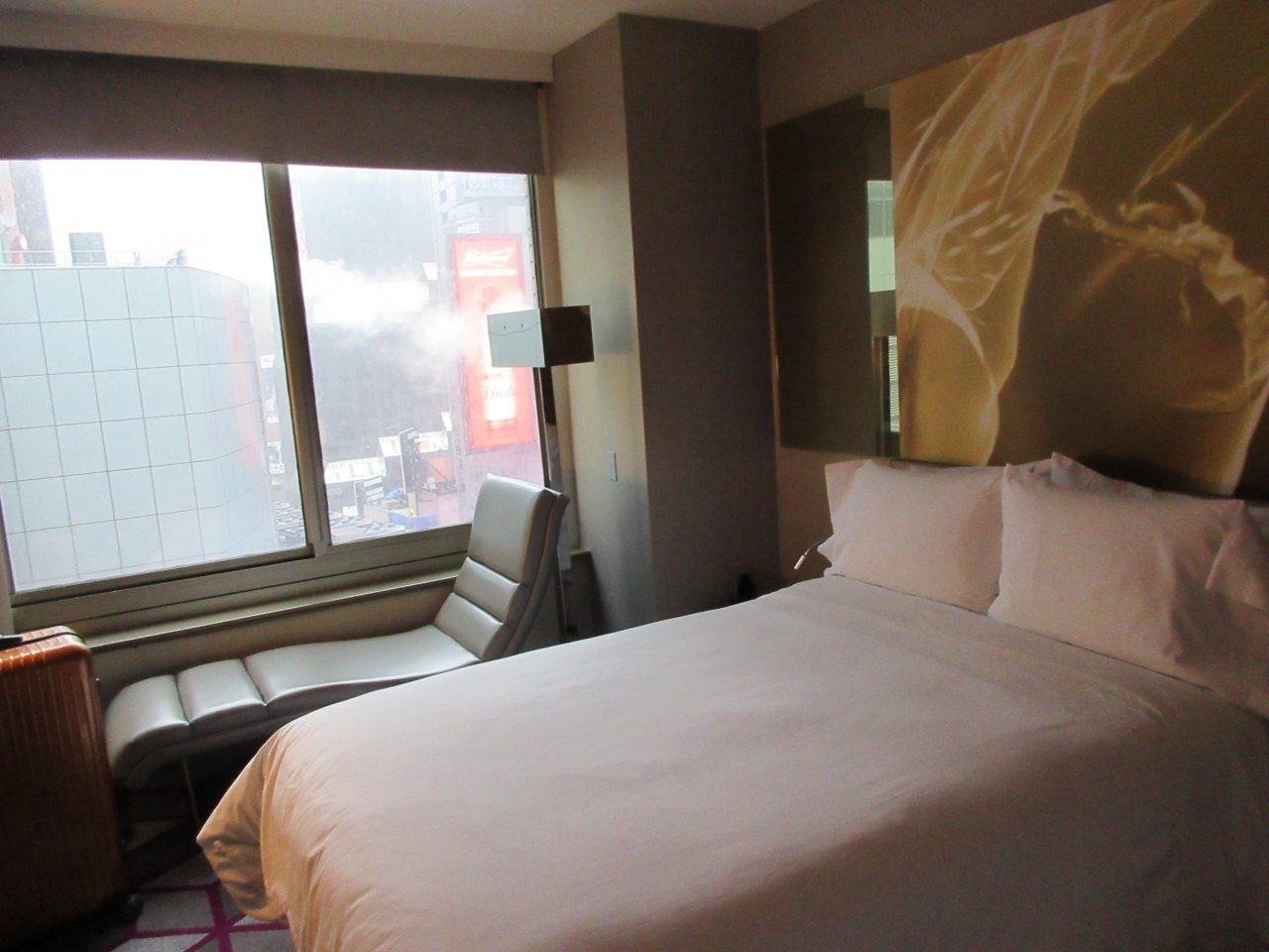 タイムズスクエアの中心でネオンキラキラに泊まりたいとチョイスしました。NYCエアポーター(バス)を使ってポートオーソリティからスーツケース引きずって歩いたら近くはないけど、街中を見られるので苦にならず。ブライアントパークからが近いかもしれません。部屋は2108号室で、ネオンの見える部屋でした。ロビー階までは誰でも上がれ、上階の部屋にはカードキーをかざしてエレベーターに乗るのでセキュリティ安心です。高級な感じではなく、ポップな感じで、ロビーと一体のバーは騒がしいです。が、部屋は静かです。今回、おそうじのおばさん、ロビースタッフ、修繕の人と皆、フレンドリーです。大きなホテルでないので、ホテル外にすぐ出られて、すぐ隣に24時間営業のデリ「Danny's Gourmet」があるので、とても便利でした。室内にポットありませんから、ドリンクを買いに行きました。タイムズスクエアに泊まると、メトロを使わずに行ける場所が多いです。タイムズスクエアのメトロの駅には日本語の券売機があるので、楽でした。豪華なホテルを求める人には向かないと思いますが、立地重視の人にはお勧めです。タイムズスクエアを眺めるには部屋の向きを選んだ方がよいと思います。レストランは1階の路面にあり、誰でも入れる町中のレストランって感じです。