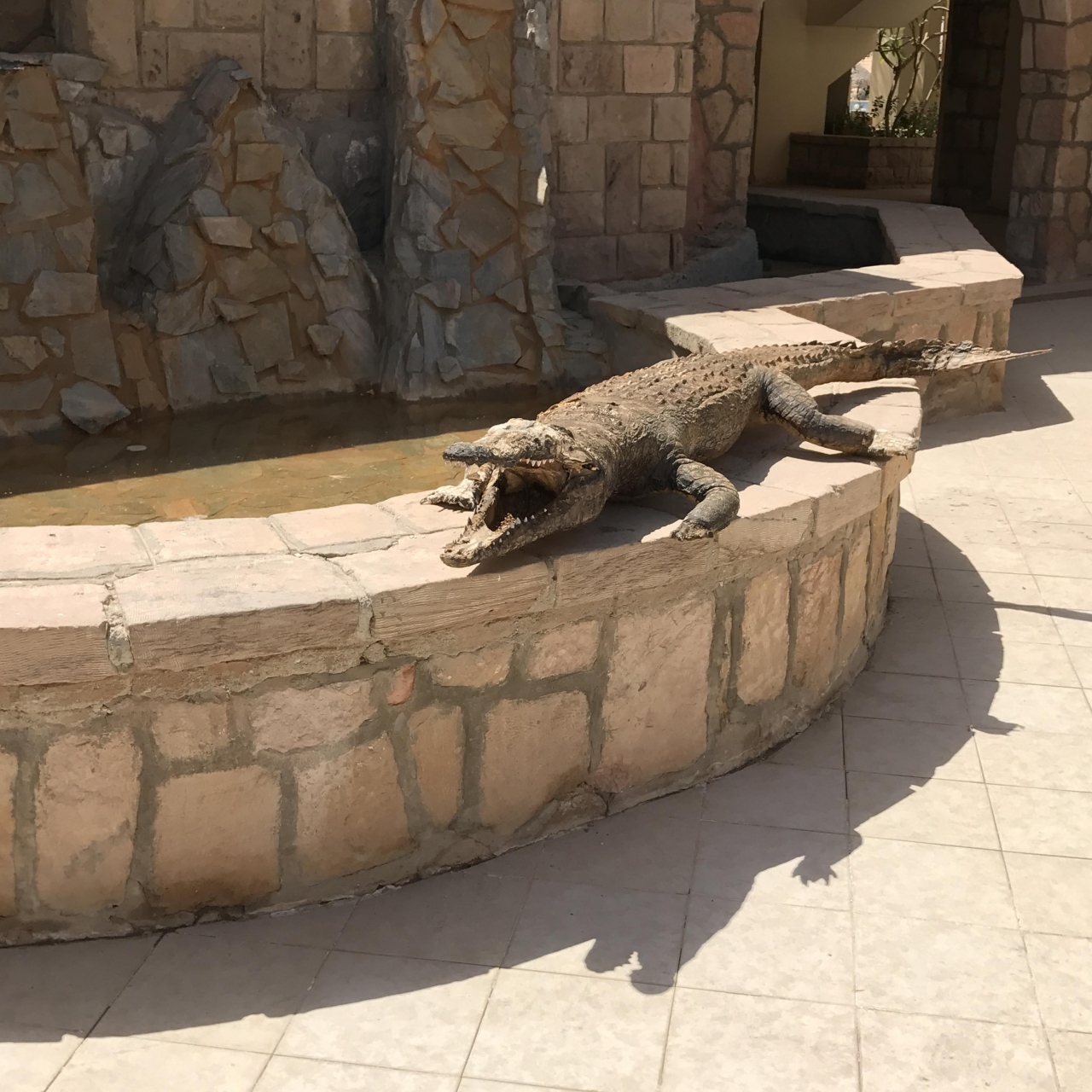 中庭には花と緑が豊かで、水場には大きなワニの複製が!