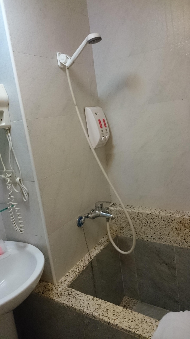 格安ツアーで行ってのホテルでした。ドアを開けてベッドまでの距離1m未満かと。ツインのベッドの間は、人ひとりが通れるくらい。窓がない部屋だったので、すごく圧迫感がありました。テレビの前に棚のような台があり、そこに鍵や食事券(朝食付きだったので)などテーブルにおけるようなものがおけるスペースがあり、その横に水のボトル・ポット・あと歯ブラシ・くしなどのグッズがかごに置いてありました。その台は腰の高さぐらいで、30㎝ぐらいの三角形スペース、その前に腰掛けることのできるスペース(2人の手荷物がおけるくらい)が荷物を置くことのできる場所でした。シャワーは、固定のものではないので、普通に使えますが、シャワーカーテンがないので、バスタブとは言えない正方形のタイルばりの中に座り込むようにすると、水はねは防げると思います。