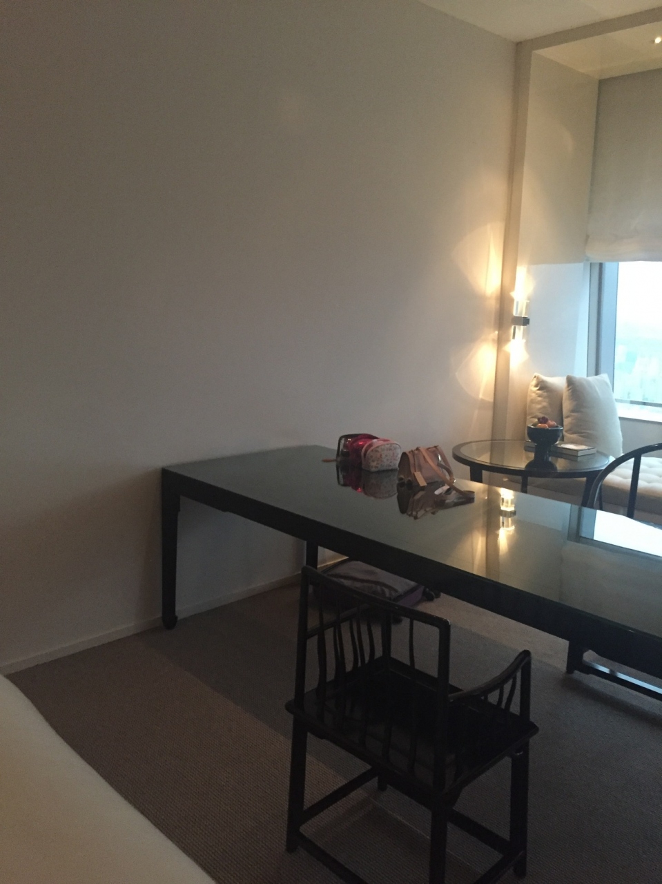 上海、浦東の金融環球ビルの上層部にあるホテルです。ロビー階は90階で、もう雲に届くほどです。部屋へは、そこから下に専用エレベーターで下って行きます。部屋は大きな窓の明るい部屋で、バスルームも広くて洗い場がありつかいやすかったです。