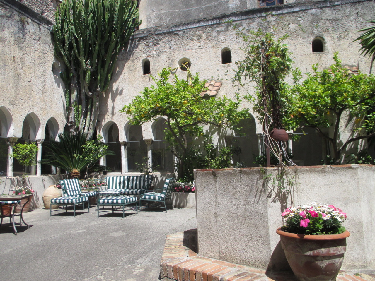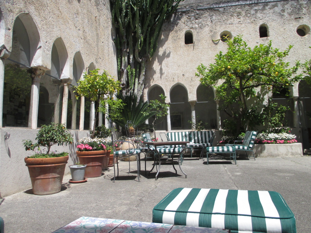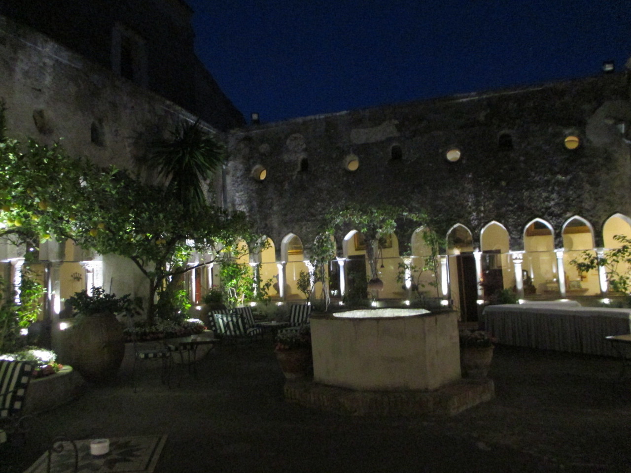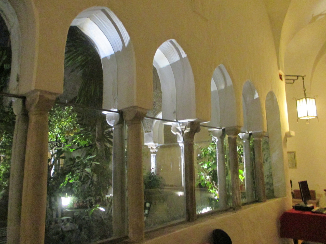 修道院だった建物を改装した趣あるホテル。周りを回廊に囲まれた庭は昼も夜も素敵な雰囲気。全ての部屋にベランダがあり椅子とデーブルもあるので、海をみながらお茶やお酒など可能。