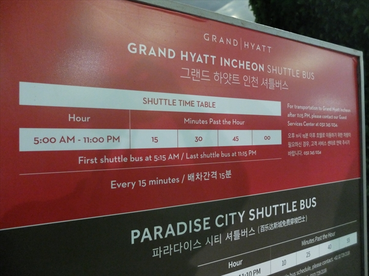到着ロビーからシャトル・バス乗り場へ行き、グランド・ハイアット・インチョン専用の案内板が出ている所で待てばよし。