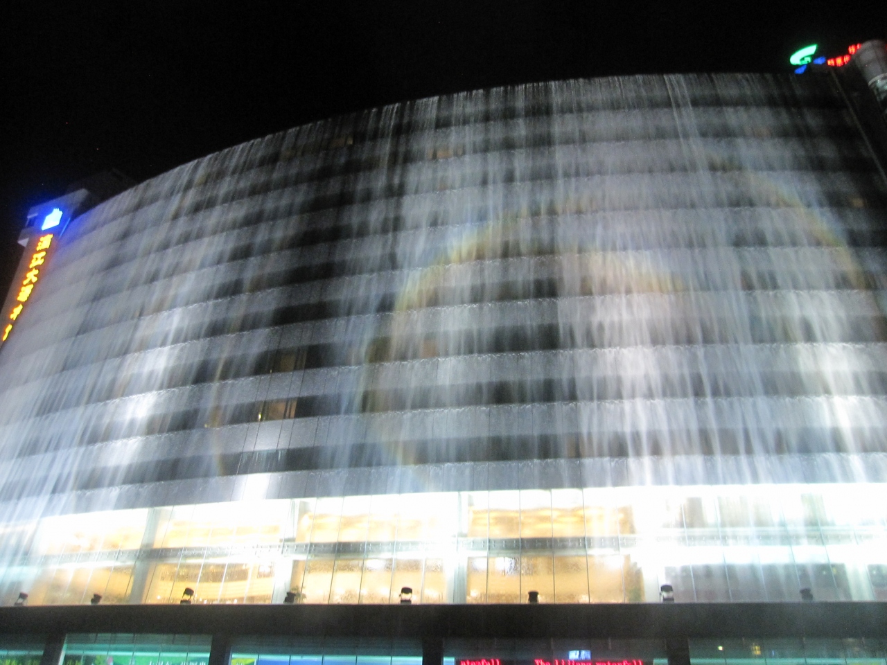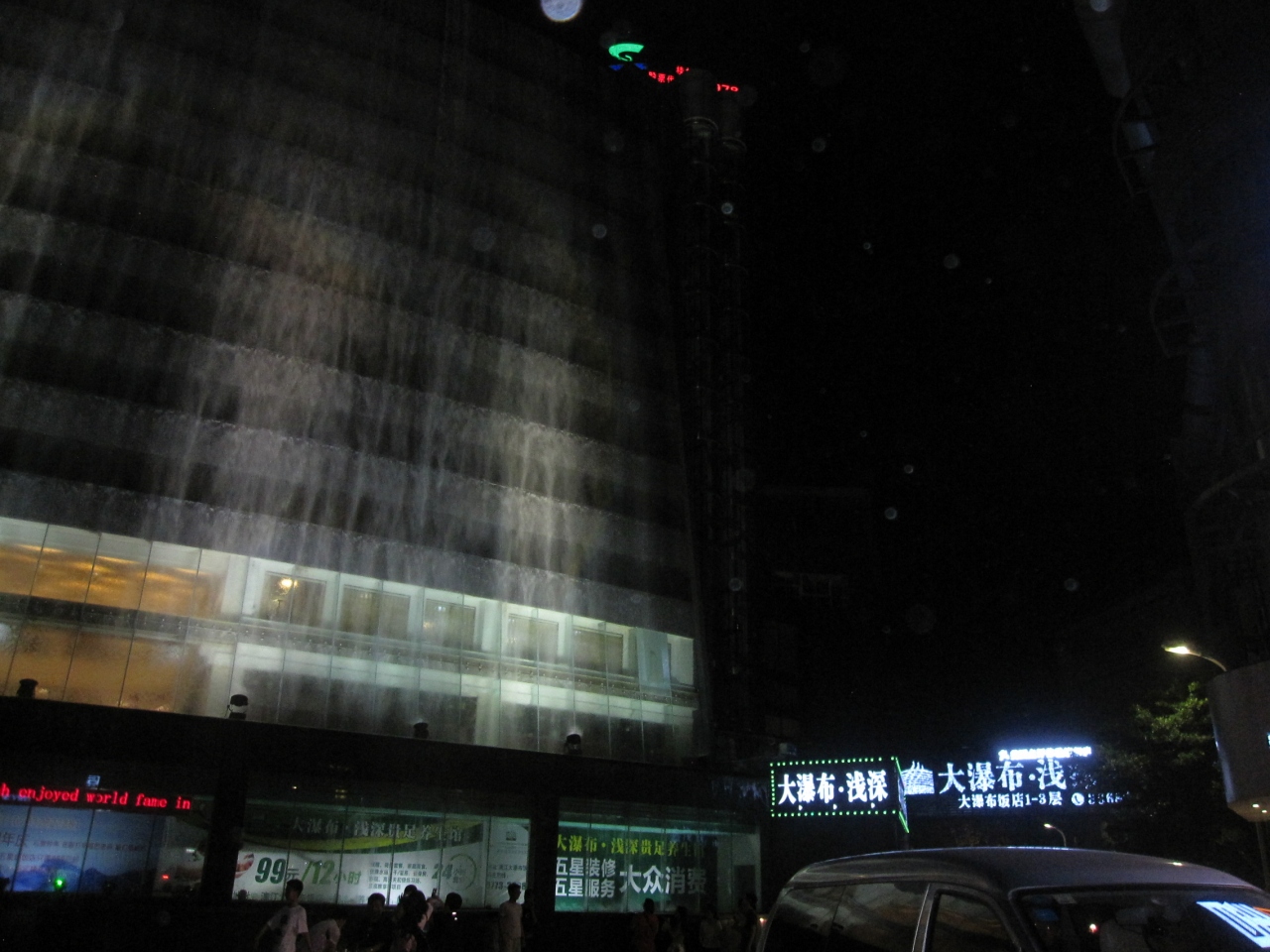 两江四湖ナイトクルーズを終えて正陽街に向かう途中に遭遇したホテルのからの人工滝のショーです。