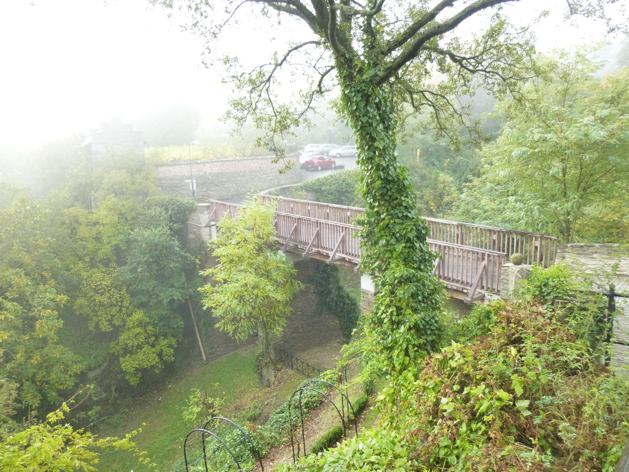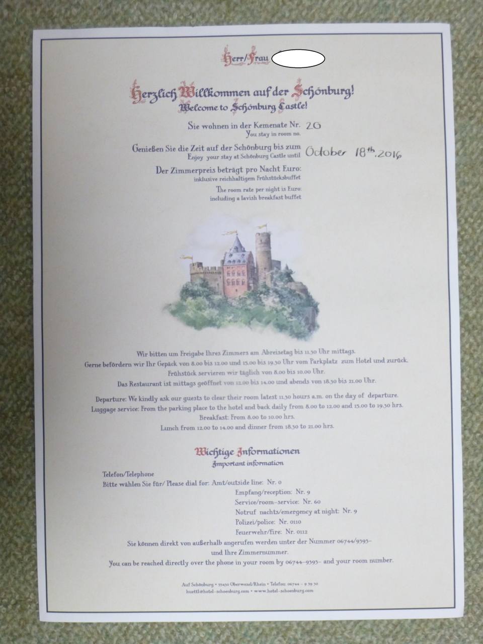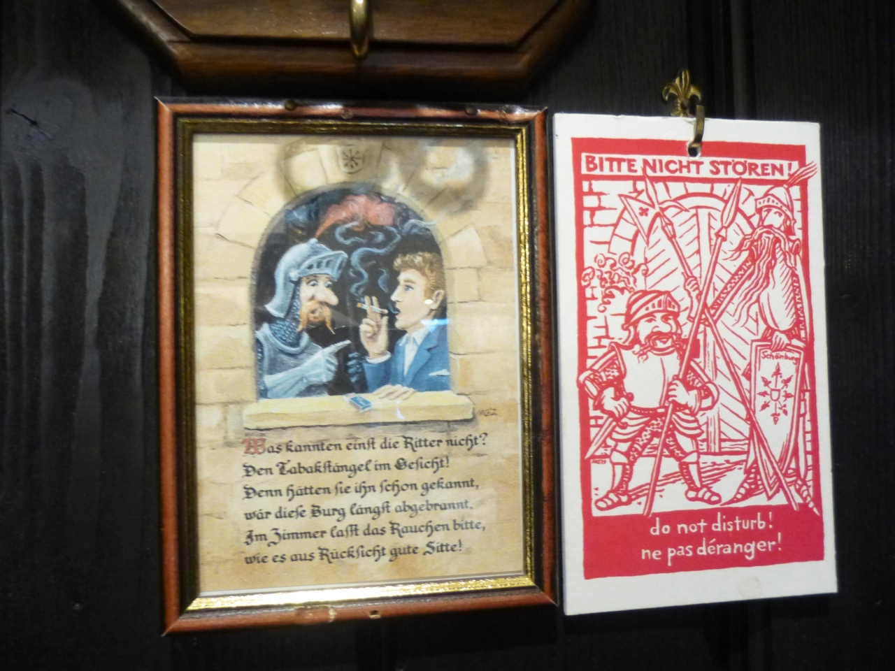 時計がのるシュランク(中にオーディオ装置、冷蔵庫が内蔵されていた)、中央奥に長椅子、その上の壁に絵画(絵の裏にTVが隠れていたが、できるだけ現代を意識させないようにしている)が掛かり、左の窓際にある卓上にはサービスのリキュールの瓶とグラス、リンゴ3個にナイフとフォークが添えられ、部屋の重い鍵があり、古城らしく、昔の書状のような巻物を開いてみると、歓迎の言葉と共に、部屋の番号、城の案内などが、昔の書体(独・英語)で書かれている。それに裏面に近年古城の裏手の斜面に造作を加えた庭園の図があった。