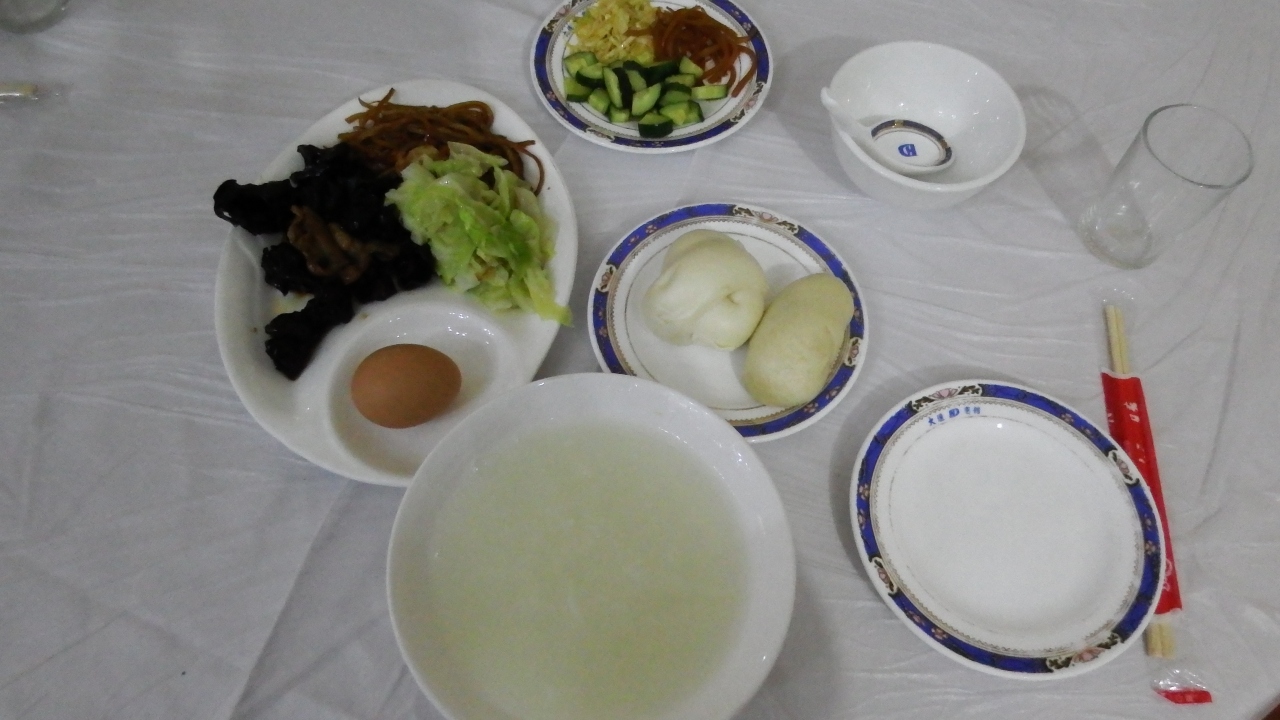 2階の喫茶・クラブ(夜)大和は小さい部屋で10人定員位だが、趣のある歴史を感じる部屋である。ママが日本語を話す。朝食は大広間。ここも歴史的な場所である。中国風のセットメニューでトレーにおかゆ、饅頭、野菜、ゆで卵、漬物、お湯が出てくる。