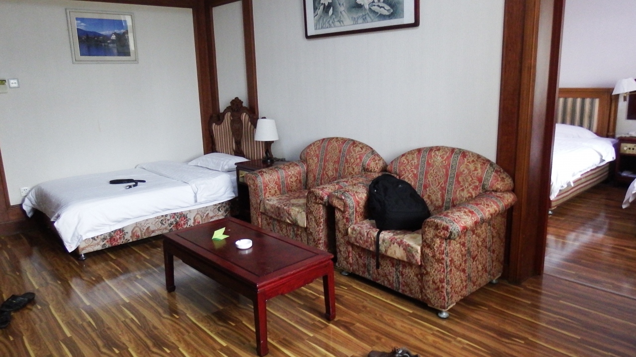 部屋は広場正面のスイートツイン。広場正面の部屋はスイートツインのみで、本来は特別室なのであろうが、中級ホテルの現在は料金も7千~8千円である。スタンダード部屋は5千以下であるが、この程度の差額なら歴史に残る中山広場が見える数々の有力者が宿泊した部屋に泊まってみる事を勧める。二部屋からなり、ベッドルーム(シングルベッド2台)とリビングルーム(ソファー、デスク、鏡台、洋服ダンス、冷蔵庫冷えているが無料ペットボトルはない、ベッド)。洗面所は洗面台、トイレ、バスタブ。広さは部屋も洗面所も現代では狭く感じる。お湯は出る。排水も問題ない。大連賓館の石鹸などグッズが一通りある。クーラーも効いている。テレビは映るがNHKはチャンネルを回しても分からなかった。窓からは中山広場が正面に見える。夜はライトアップされる。宿泊するのに問題はなく、歴史を感じるホテル・風景、1泊程度なら外資系ホテルに泊まる必要はない。宿泊客が少ない事もあり、廊下や隣の部屋から声が聞こえてくることはない。正面広場ロータリーの車のクラクションと2階クラブの音楽が小さく聞こえてくるだけで、気になることはない。