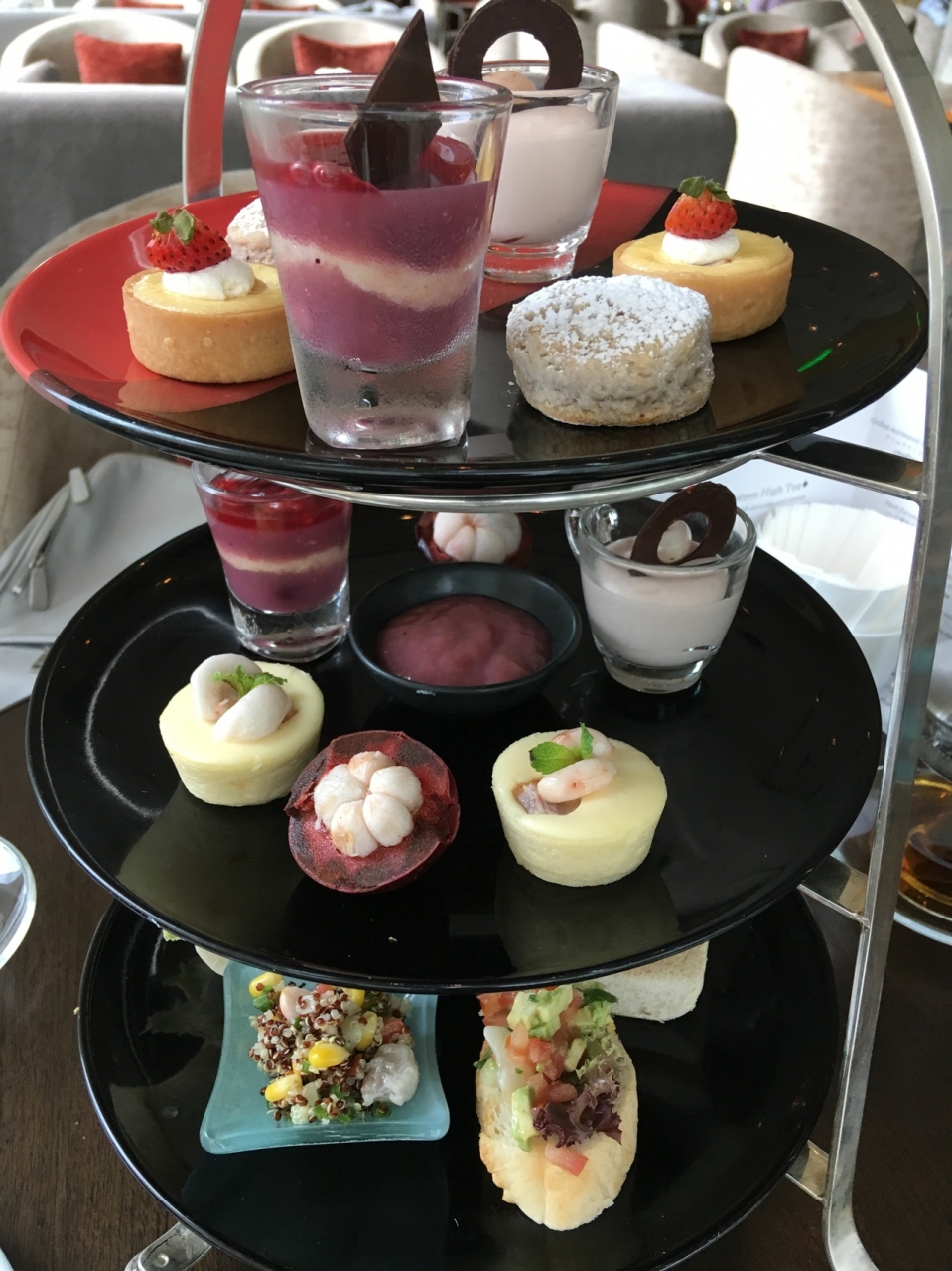 ウェスティンホテル内の期間限定のアフターヌーンティーに行きました。夏のマンゴスチンの時期です。春にはマンゴーもあったとか。マンゴスチンをふんだんに使った料理はどれもおいしかったです。スイーツばかりでなく、甘くないサンドイッチ類があったのもよかった。量も多すぎずちょうど良いです。
