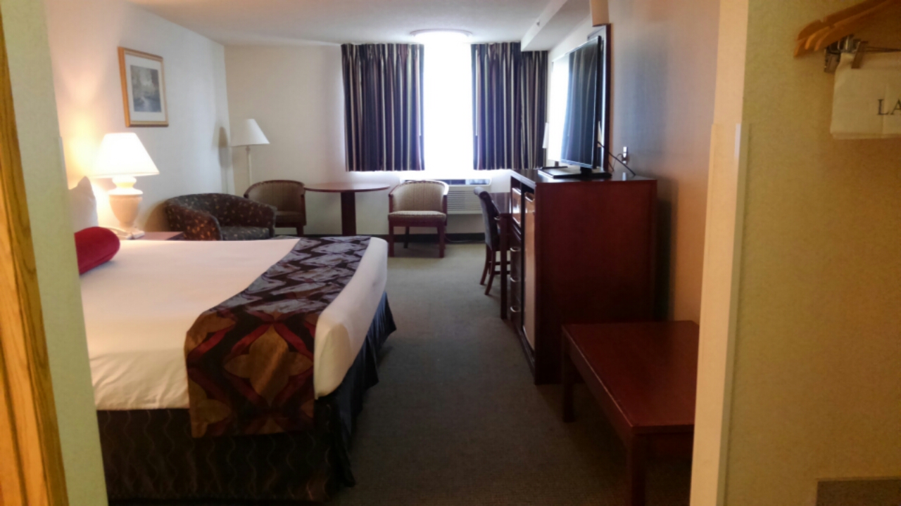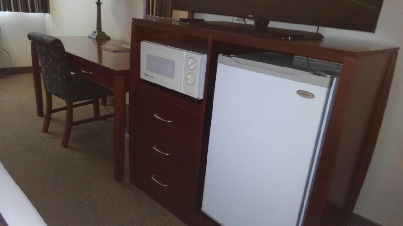 キングサイズベッド1台の部屋に2泊しました。室内には冷蔵庫、電子レンジ、コーヒーメーカーがありました。部屋は広く、きれいに清掃されていました。バスルームはバスタブ付き。石鹸、シャンプー、コンディショナーのアメニティーグッズがあり、ドライヤーも備え付けられています。Free Wi-Fiは繋がりやすく、ストレスなしでした。朝食はパンやヨーグルト、ゆで卵など簡単なものでしたが、食事エリアに日本語を話せるスタッフがいたので、ワッフルやパンケーキの作り方を教えてくださり、助かりました。