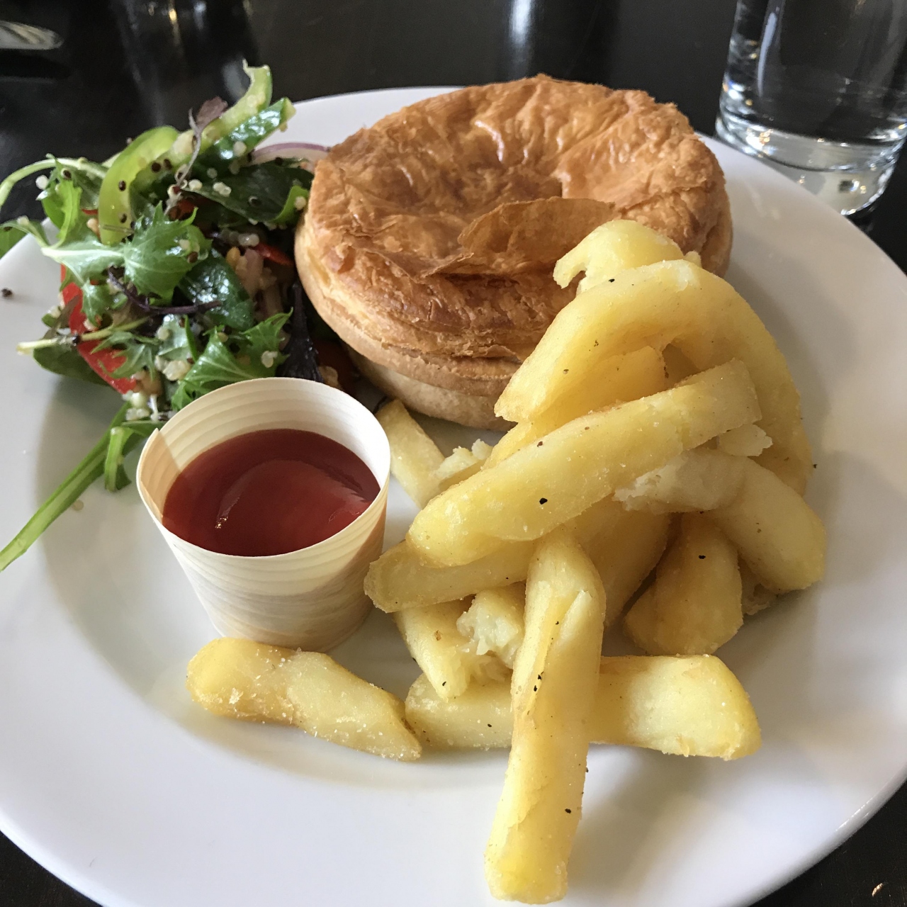ワンプレートランチで、サラダ、ポテトフライ、ミートパイ