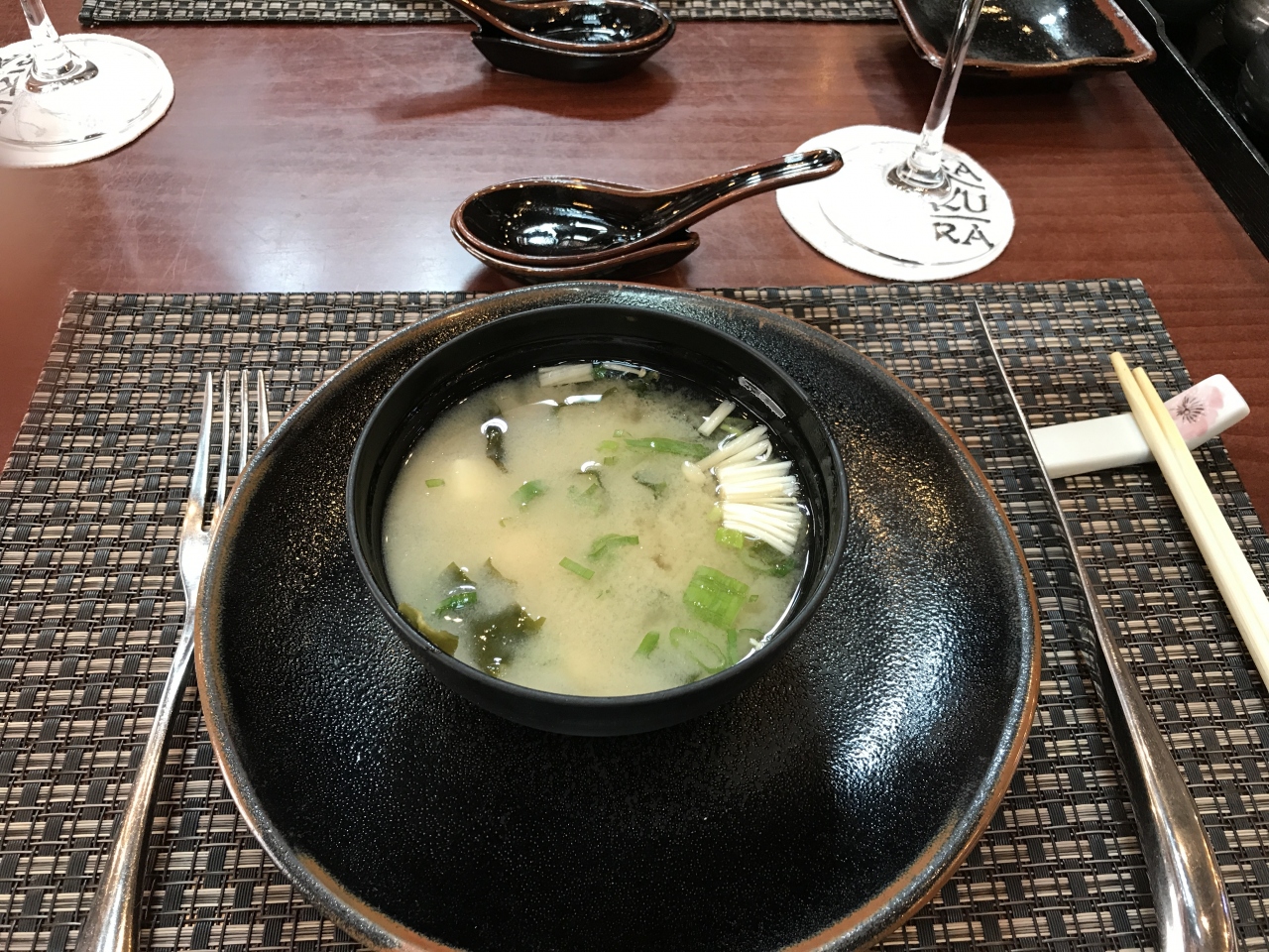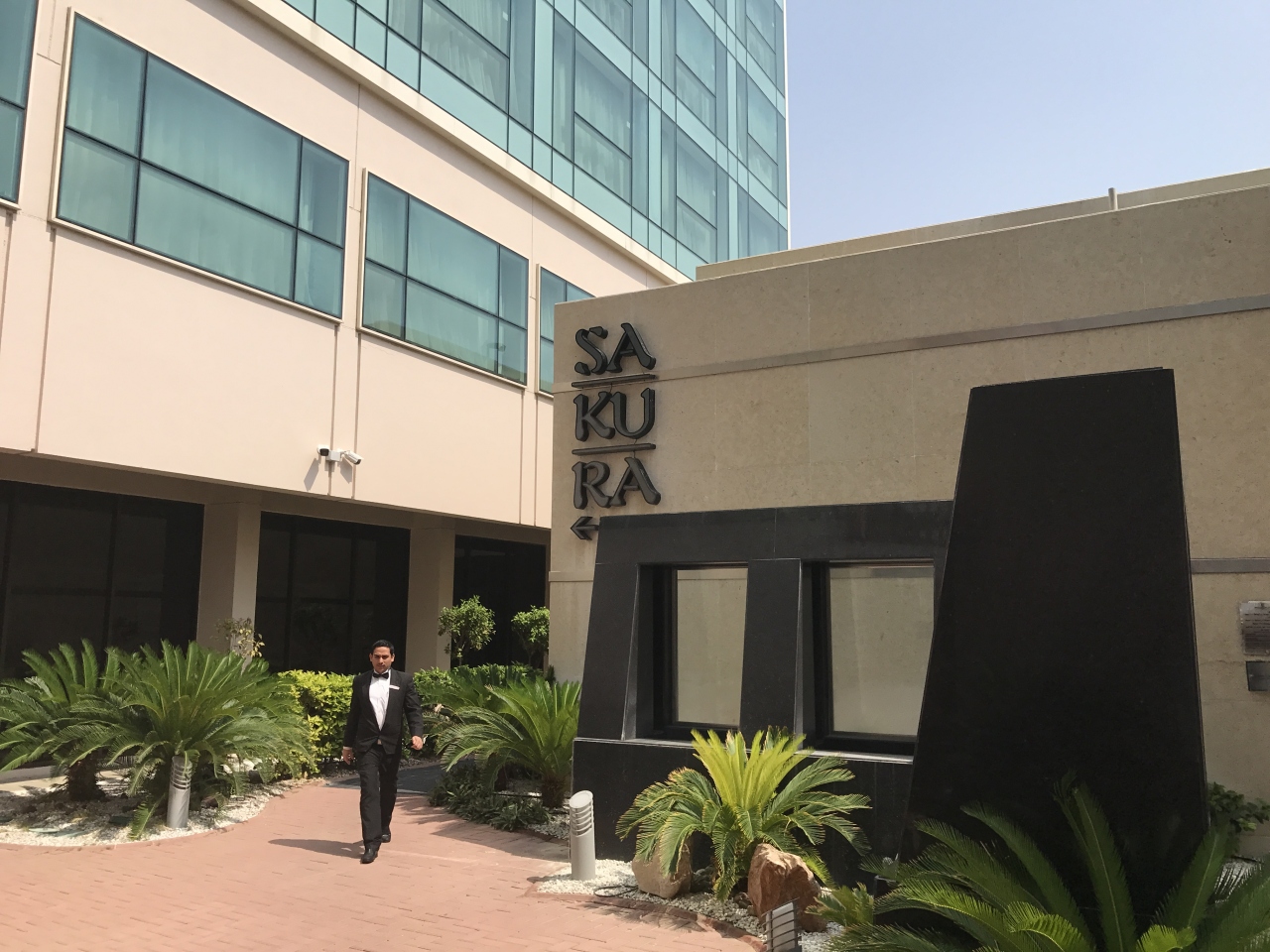 ランチでホテル内のSAKURAという日本食レストランを利用しました。ランチは13時から。セットの弁当は8種類あって115サウジリアル(約3500円)ほど。私が頼んだのはSAKURA BENTO Bで、酢の物、味噌汁がまずサーブされた後、刺身、天ぷら、照り焼きチキン、ツナサラダ、漬物、そばが盛られた弁当箱?が運ばれてきます。思いのほか、しっかりした日本食。港があるせいか、刺身も悪くない。量は半端なく、ちょっと食べきれないほど。ただ、味噌汁がスープ扱いで、飲みきってから提供されるのは微妙な感じですが。そのほか、メニューには丼ものや、そば、うどんなどの単品もありです。ちなみに水はエビアンのボトルが30リアル超と料理に比べてかなりの高額でした