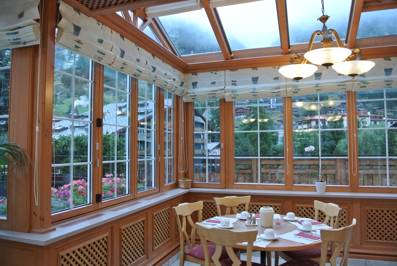 マッターホルンビューの部屋に泊まりました。部屋のバルコニーから朝焼けのマッターホルンを見ることができて感激でした。部屋は清潔でポットもありました。なによりおすすめは朝食ルームです。ガラス張りになっていて、マッターホルンを見ながら朝食を取ることができます。メニューも美味しかったです。この朝食ルームの写真を見てこのホテルに決めました。