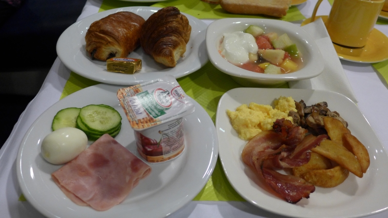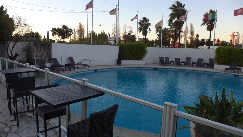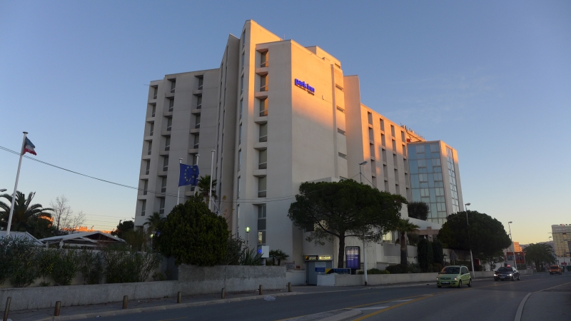 トラピックス(阪急交通社)のツアーで2連泊しました。ニース空港のすぐ近くにあるホテルです。空港からバスで5分もかかりません。歩いても10分足らずです。ロビーは広々としていました。客室も広くて清潔でした。バスルームにはバスタブがあって、長旅の疲れを癒すことができました。空港とは反対側の部屋で、窓からは電車の線路が見えて、たまにTGVが走っていました。喉が渇いたので、自動販売機でビールを買おうと思ったのですが・・・ビールはないし、コーラが€4.00(約600円)とメチャ高!バスの運転手さんから買ったミネラル・ウォーターで我慢することにしました。お酒が好きな方は、日本から持参するか、空港の売店で買ってくることをお勧めします。建物の横にはプールがありました。夏に泊まられる方は、水着を持参した方がいいですね。朝食は、ヨーロッパのホテルの朝食としては充実していました。クロワッサンがとても美味しかったです。市街地までは遠いけど、ツアーだったので問題はありませんでした。