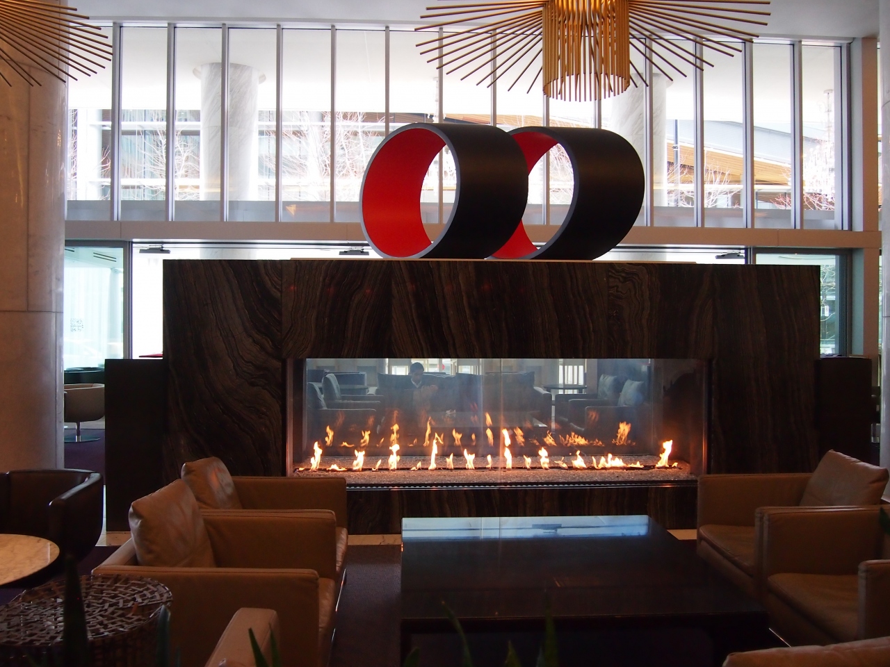 ロビーのレストランが大きな暖炉のある豪華な造りで、