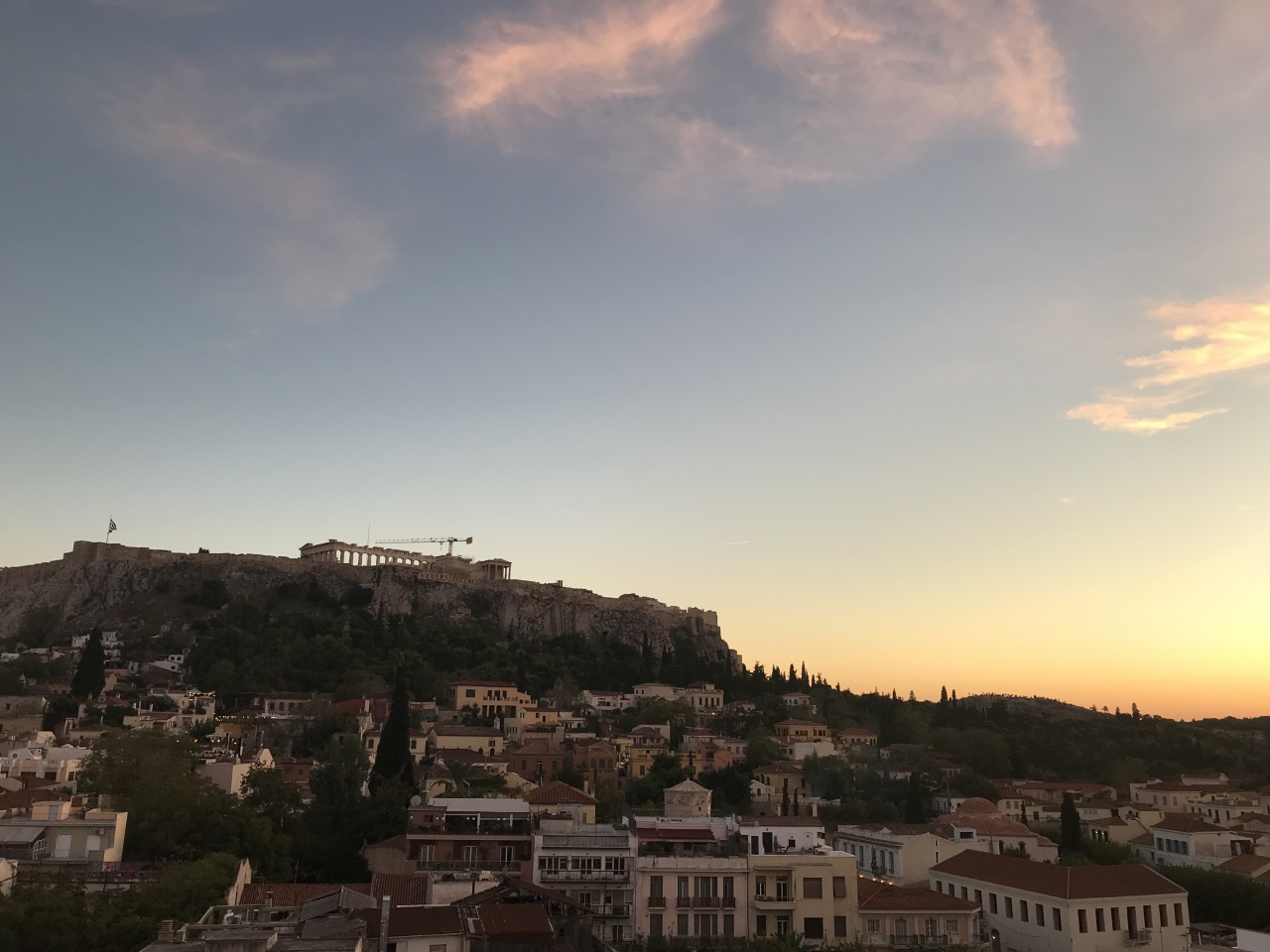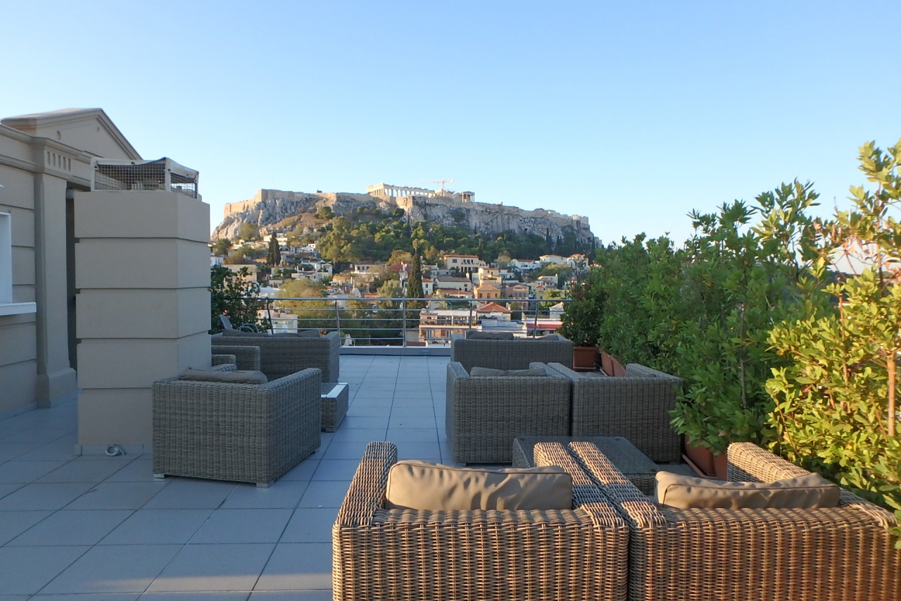 ・屋上からパルテノン神殿が見えます。オープンバーになっていますがドリンクを頼まなくてもOK。朝も行けます(バーはやっていません)。バーの奥にも場所はあるので、ドアを開いて満席?でもあきらめないでください。6階で降りて階段利用します。