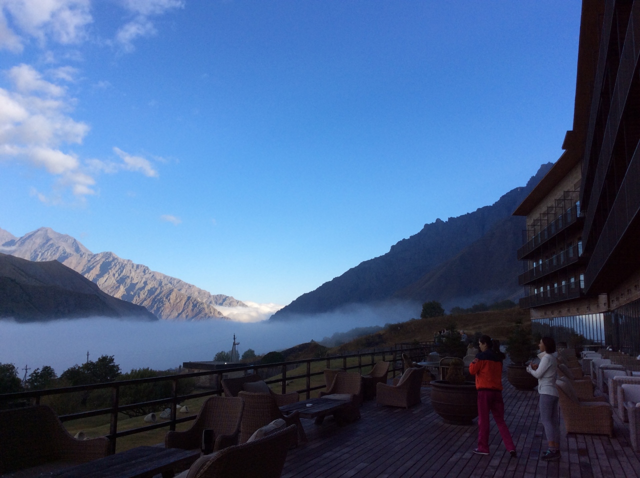 大コーカサス山脈を越えてジョージアの首都トビリシとロシアのウラジカフカスをむすぶ約200㎞のハイウェイ“ジョージア軍用道路”のジョージア側の終着点ステパンツミンダ(カズベキ)にある、現在最もクラスの高いリゾートホテル。