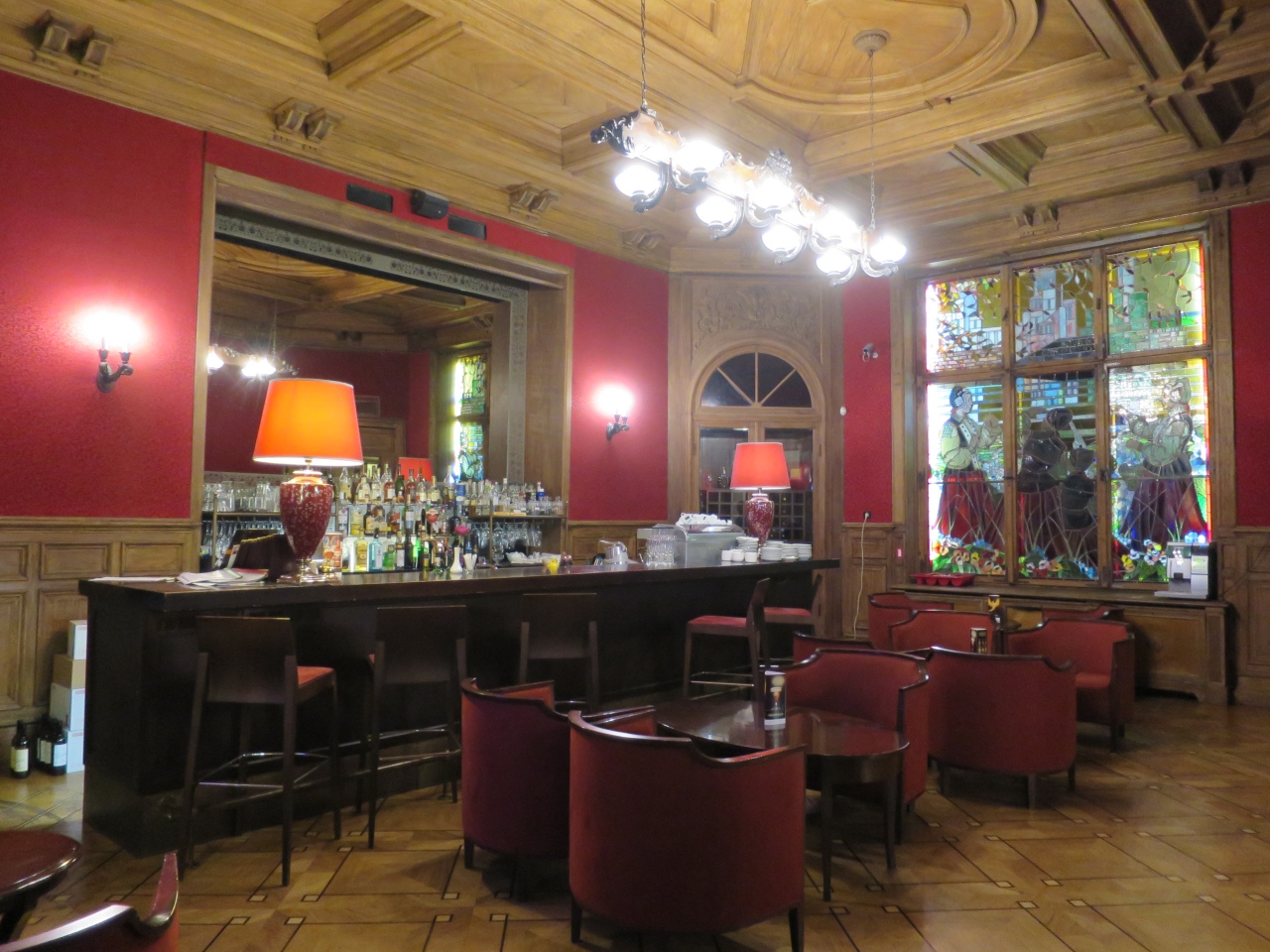 大理石のエントランス・ホールやレストランに併設のバーのステンドグラスも必見です。