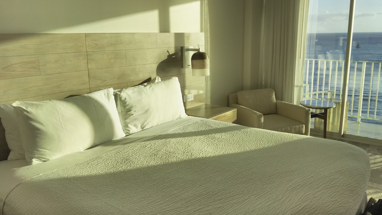 10月から名前も変わったのですね。パシフィックビーチホテルという名前のときに利用しました。オーシャンタワーに宿泊。当時はまだ1F部分が工事中でしたが、ホテル客室は先にリフォームされていてピカピカです。13Fのオーシャンフロント。トイレもベッドもテーブル、ソファもすべて新しくて気持ちが良いです。ラナイはちょっとちいさいですが、眺めが最高。1FにはABC storeがあって重宝します。