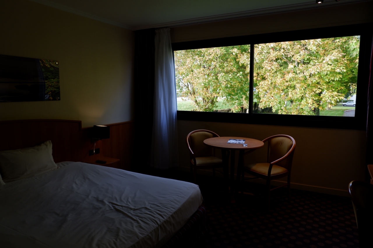 部屋からモンサンミッシェルは見えません。でも部屋にもよると思いますが、私の部屋の大きな窓からは、紅葉した裏庭の人通りのない静かな並木道が一面にピクチャーウインドウのように見られ気持ちよかったです。