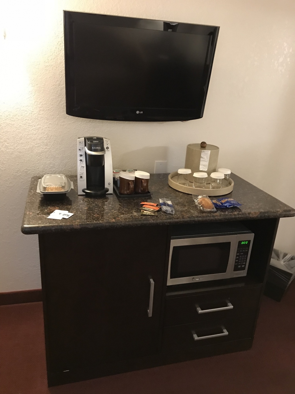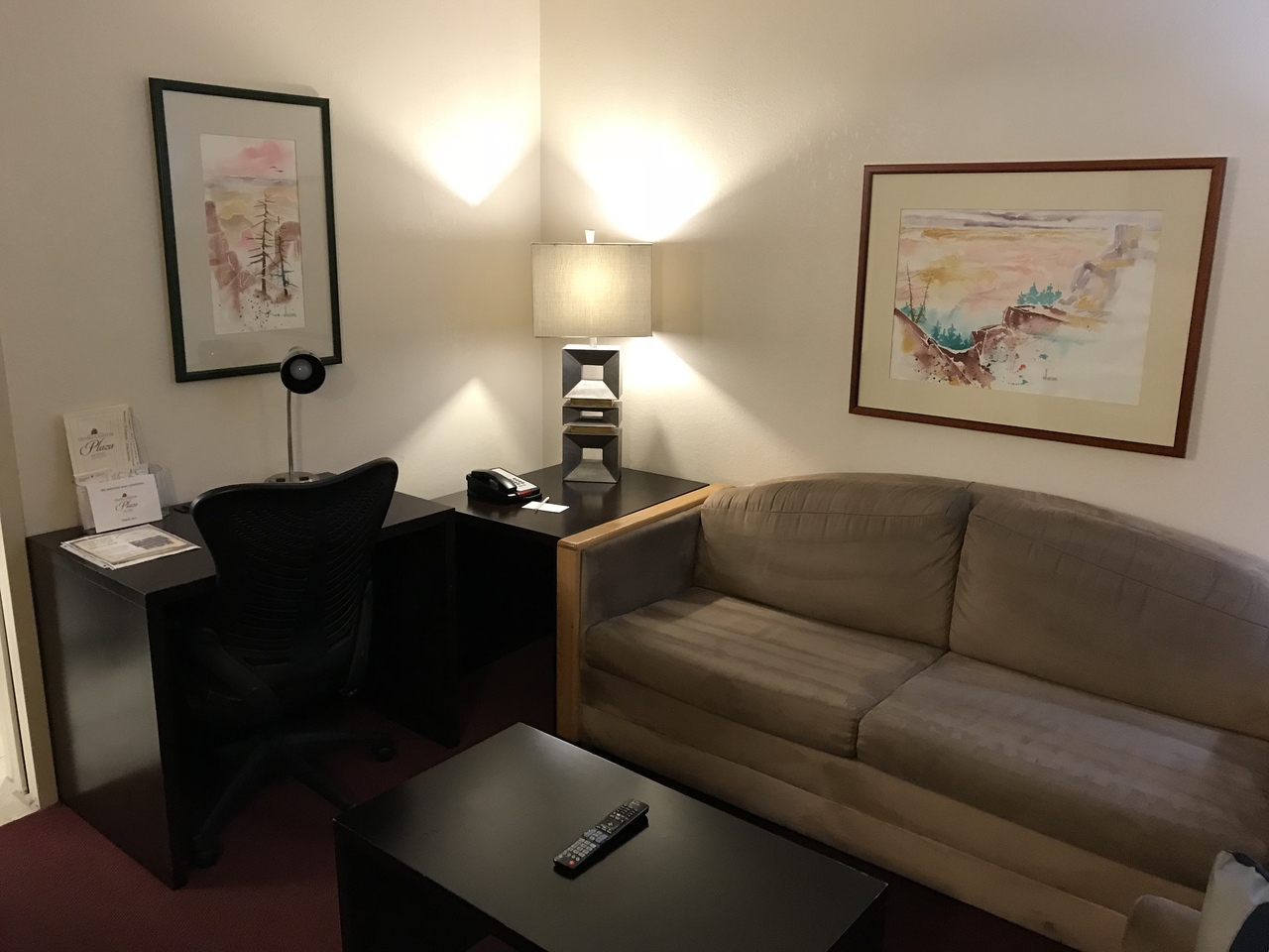 たまたまジュニアスイート的な部屋にアップグレードされましたが、リビングとベッドルームのそれぞれにテレビがあり、日本語放送のチャンネルがありました。冷蔵庫とレンジがあるので、近くのコンビニで買ったものやレストランで持ち帰った食べ物を美味しく食べることができます。ただし食器はないので要注意です。