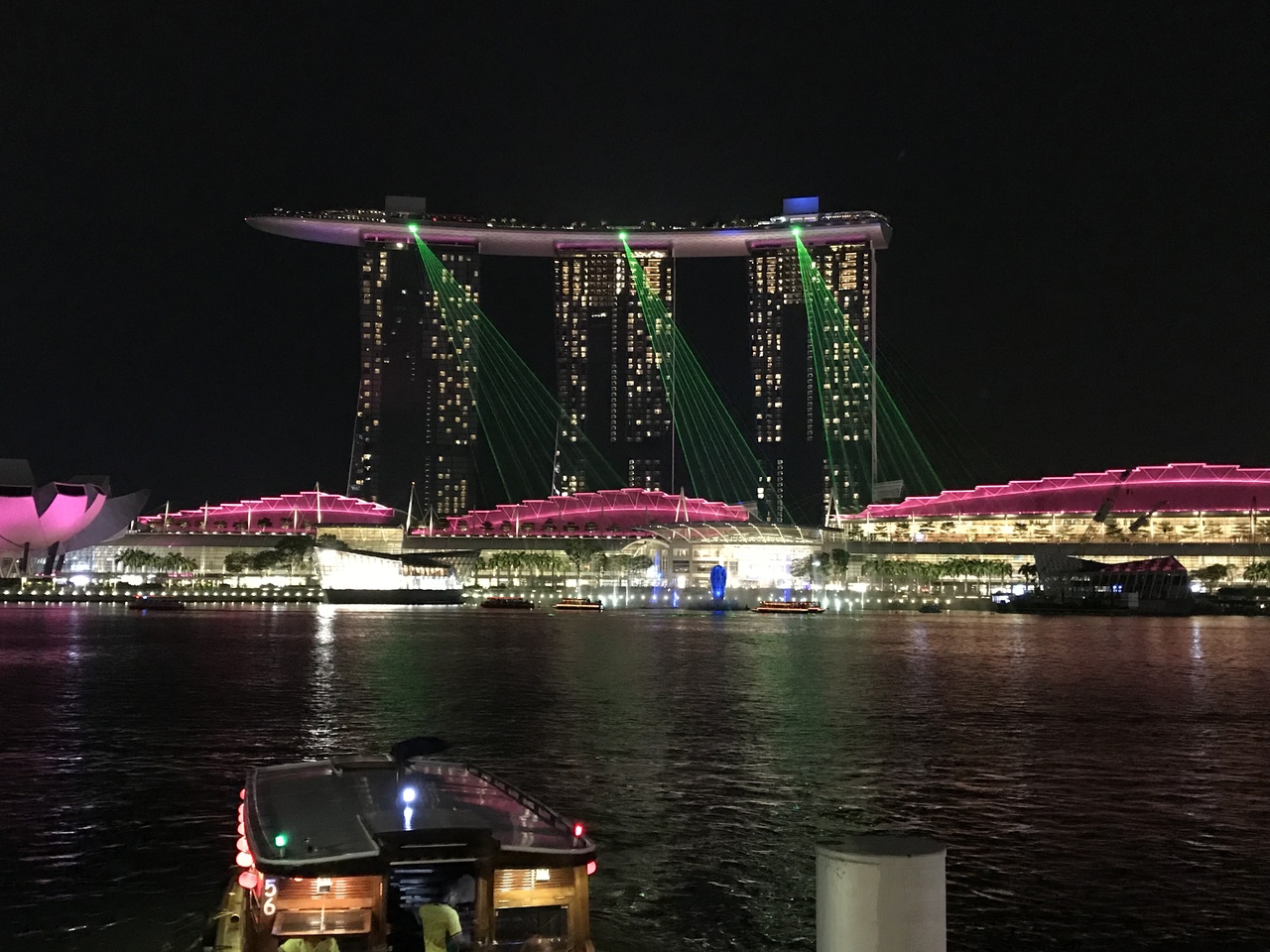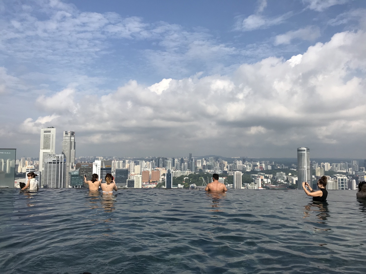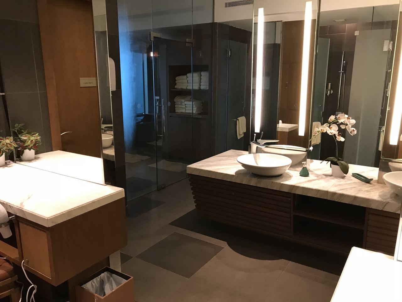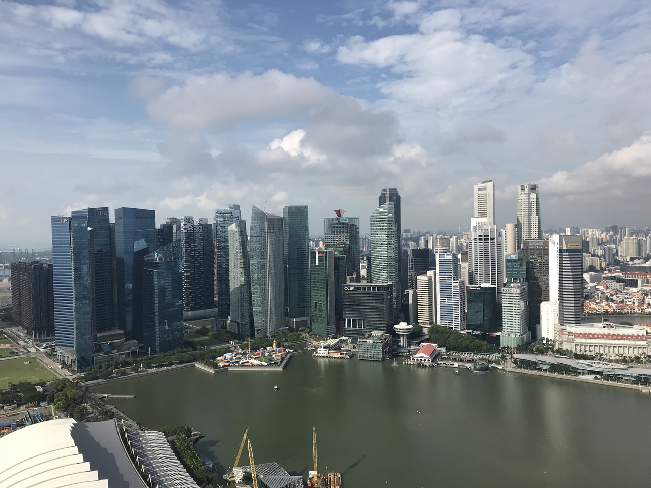 57階からなる3つのタワーが舟形の屋上で繋がっている、シンガポールを象徴する巨大ホテルです。屋上にあるインフィニティプールとスカイガーデンに宿泊者は自由に出入りできます。57階からのマリーナ側の眺めを見られるのはなかなかできない体験でした。今回はタワー2の55階にあるフィットネスジムも利用しました。こちらも宿泊者は自由に利用できます。高層階からの眺めを見ながらランニングやトレーニングができ爽快でした。マシンの他にもフリーウェイトも充実していました。パウダールームには、浴室やサウナもあり、こちらも眺望を見ながら利用できます。