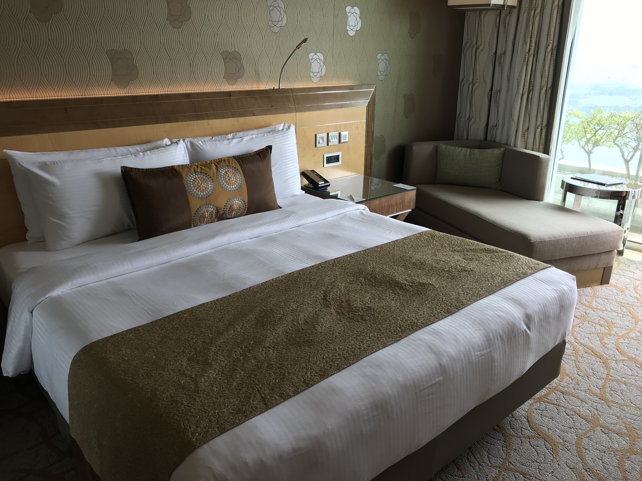 38階のガーデンビューでしたが、天井高の窓で開けることができ、小さなバルコニーもありました。ガーデンバイザベイや海を行く大型船が多く見られました。カーテンは自動開閉、USB端子も備え、設備は十分。ティーパックもTWGでした。日中は日本語専用デスクがあり、10時に訪れて荷物を預けようとしたところ、アーリーチェックインできる部屋を探してくれて、24時間近くホテルを楽しむことができました。スタッフの感じもとても良く、また調度品一つ一つを綺麗に拭き掃除をしている姿が印象に残りましたりこのホテルに泊まるのが目的でシンガポールに来る人もいると言うのがわかるような気がしました。