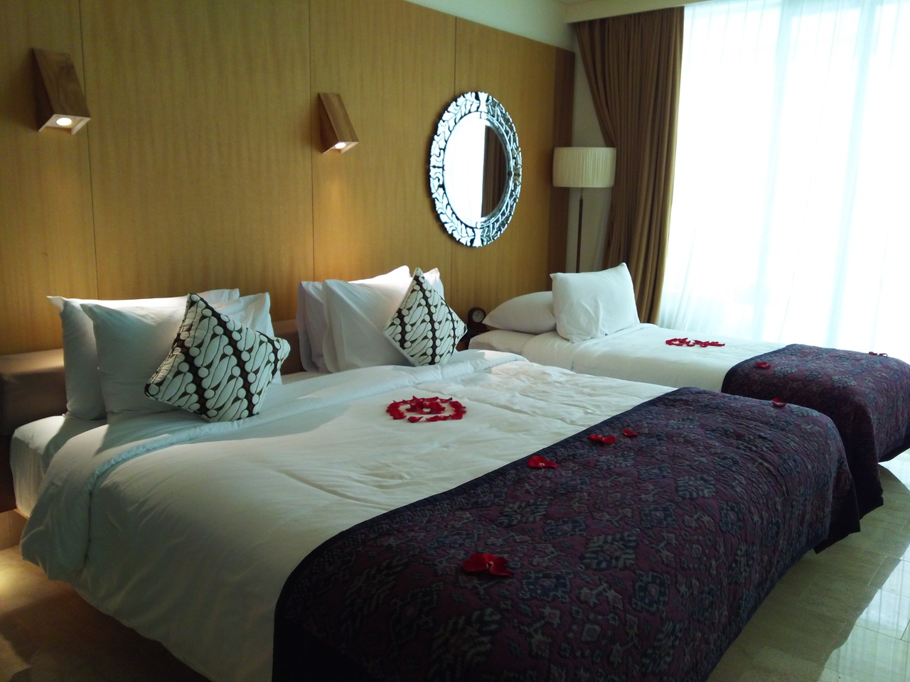 部屋は十分な広さがあり清潔でベランダも広く快適です。5歳からは添い寝不可でエキストラベッド(1泊RP500000(朝食別))を入れる必要があります。
