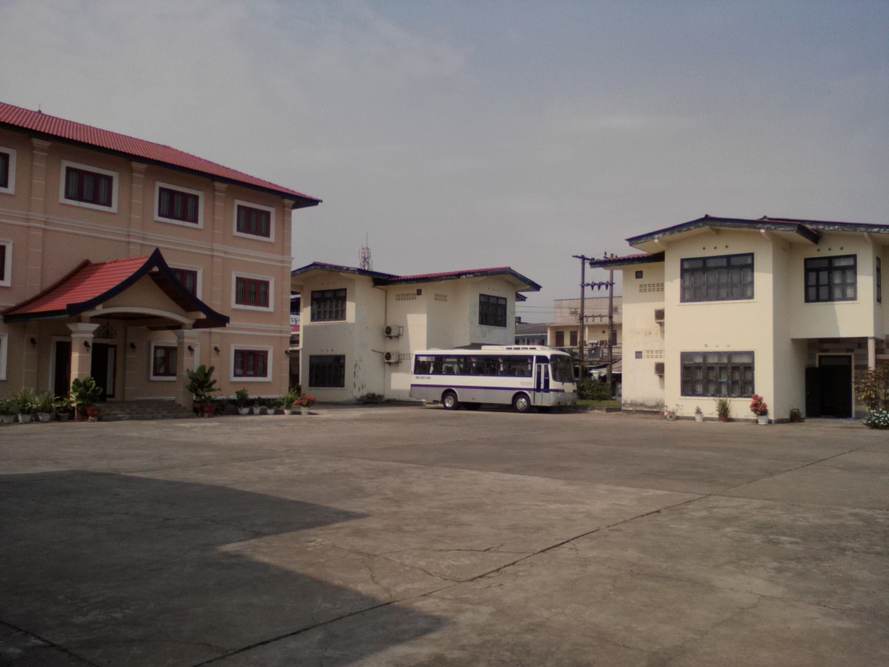 かつてはベトナムのフエへのツーリストバスの発着場になっていたせいで中央部がかなり広めの駐車場になっています。現在はバスの運行はしていません。客室棟はその周りに建っています。正面にどーんと建っているのが新館で1泊15万kip。もちろんA/Cなどフル装備です。周りの旧館には7万、8万、9万、10万kipの4タイプの部屋があります。こちらもA/C、ホットシャワー、テレビ付。一番安い7万の部屋でも清潔でこの設備ですからお得だと思います。全室プラス2万kipで朝食付きにすることもできます。Free Wifi。