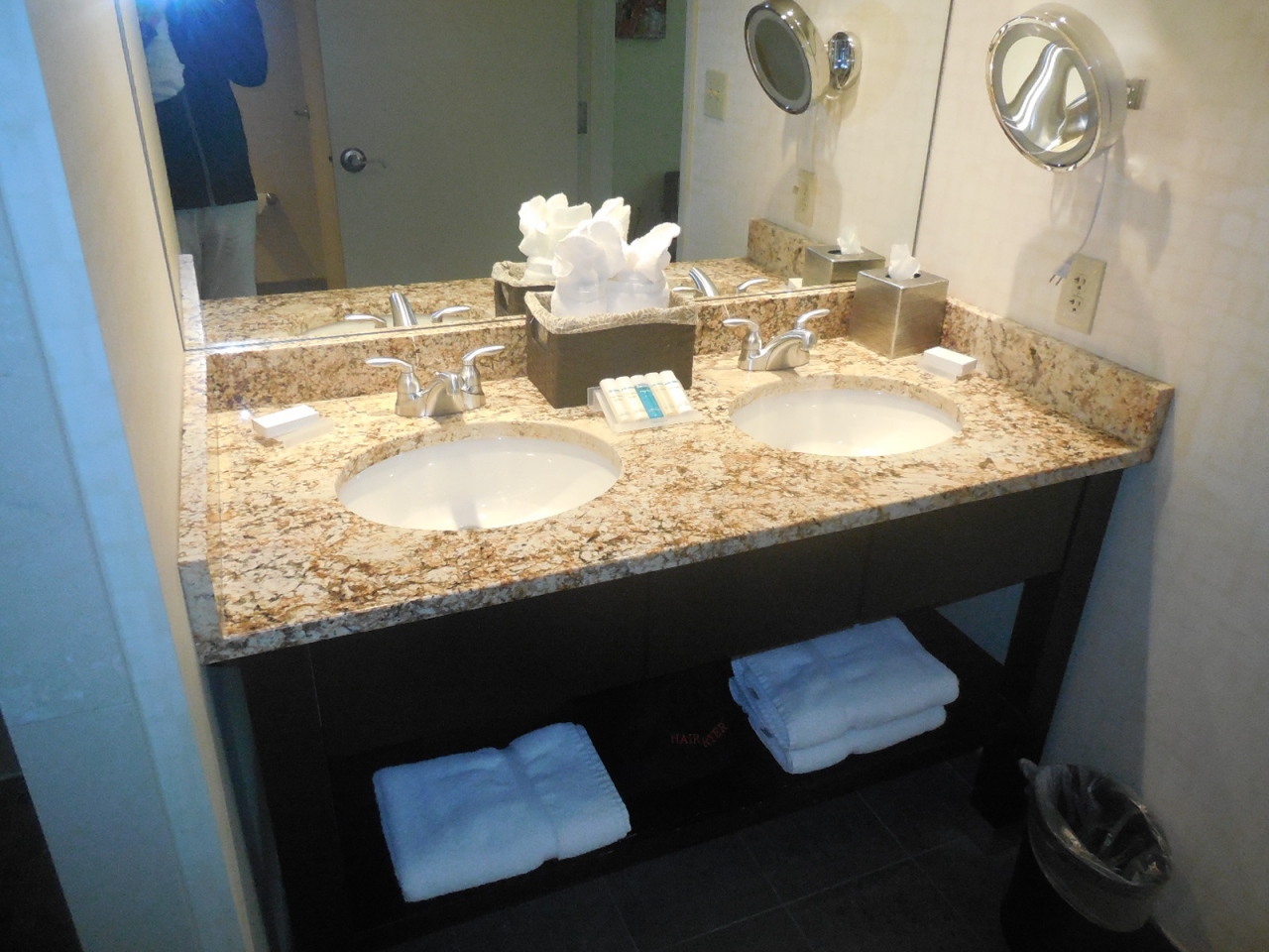 私がヒルトンゴールドなので、お部屋を最上階のペントハウスにグレードアップしてくれました。とてもラッキーでした。キングベッド、リビングルーム、トイレ2つ、洗面台3つ、大きなジャグジー、シャワーブース、クローゼット2つ、キッチンシンク、事務机、テレビ2つあります。特別のエレベーターでしか上がれません。優越感くすぐりますよ。超満足です。