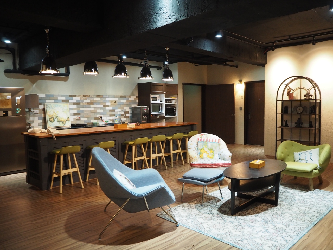部屋の前は、共有スペースのロビーになっていてとにかくオシャレでキッチンもあります。