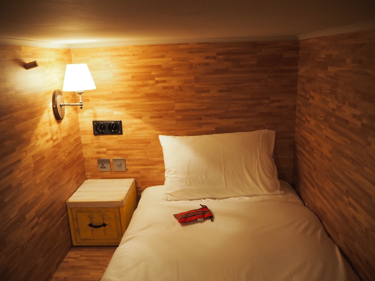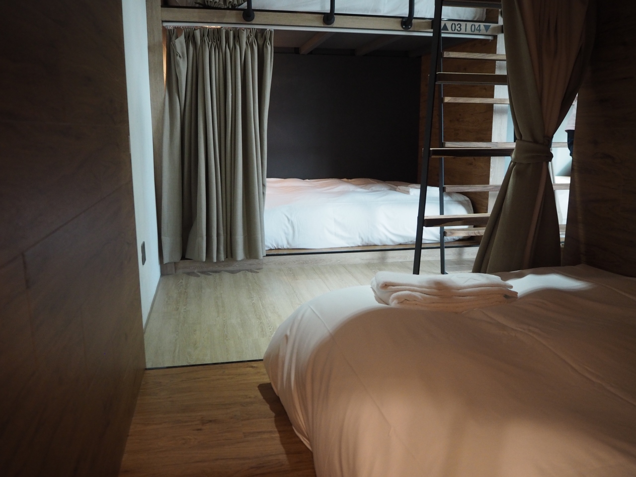 広くスペースを取られた2段キューブ状のベッドは、各キューブカーテンが付いていて寝顔を見られることはありません。