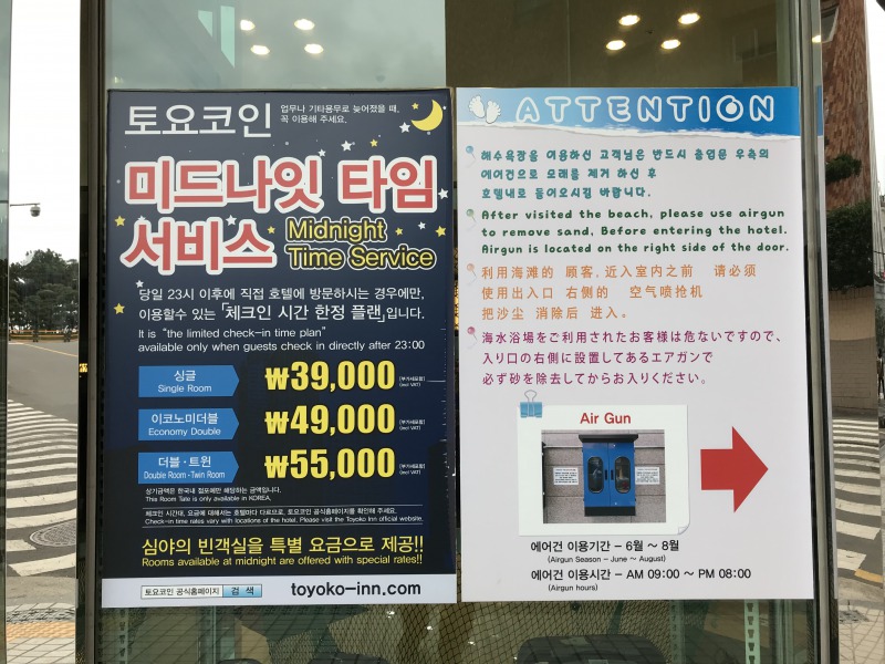 釜山海雲台には東横インが2つありますが、こちらは新しく大きい方。海雲台ビーチ前にあって、玄関には翌日の日の出の時間が掲出されていたり、海水浴客用に靴などを洗うシャワーが玄関にあったりする。
