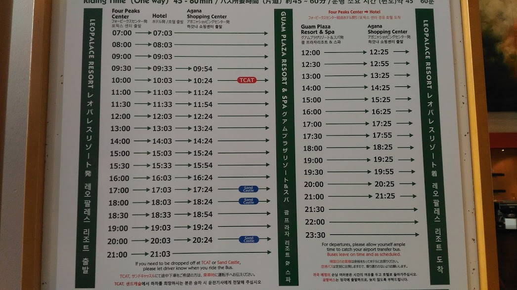 無料の送迎バスは、本数が増えて、行き先がグアムプラザリゾート&スパになり、アガニャショッピングセンターにも停まるようになりました。赤いシャトルバスのレオパレスシャトルは廃止になりました。代わりに、ショッピングモールシャトルのルートにアガニャショッピングセンターが加わりました。