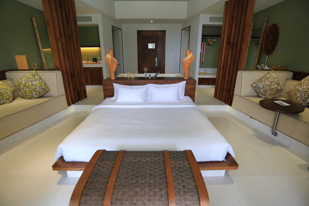 ホテル視察で訪れました。地図上などでは海に近いかどうか分かりにくいですが入り口は山の中から入りフロントは海から遠い。フロント近くにビラタイプの部屋があり、カートでメインの建物まで行くとようやく海が見えてくる。 名前の通りメインビルは貝の作りをした雰囲気。プレミアデラックスオーシャンビュールームは部屋が広く75㎡あり、部屋に入ったら大きなバスタブがお迎え。新婚カップルなら良いけど年配のご夫婦やファミリーで一緒にお風呂はいささか厳しいような気がする。シャワーも別にありだから大丈夫かな。海が真正面に見える好立地だ。プライベートにこだわり海が見えなくても良いならビラタイプもオススメです! 街から離れてますがロビー近くにタクシーが数台待機している。