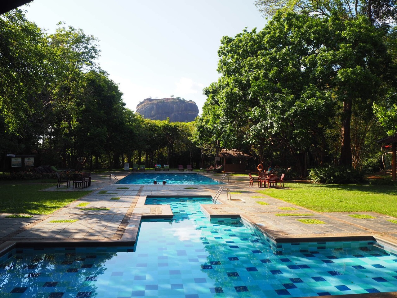 シーギリヤロックが真ん前に望むことのできるホテルです。しかもホテル内のプールから臨むことができます。