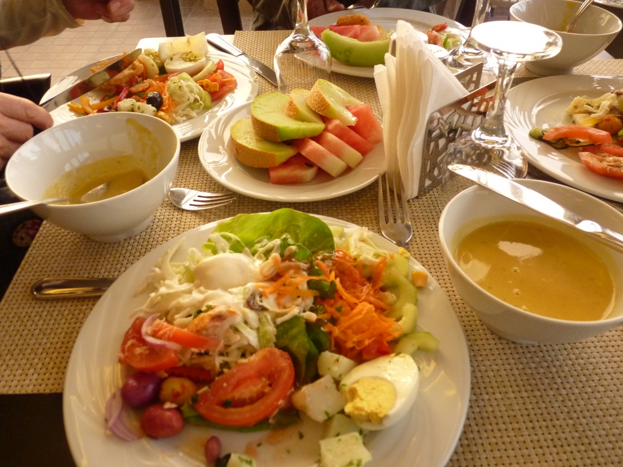 モロッコでの初日ホテルであり多少の不安もあったが、部屋は清潔でシートも良かったが、道路に面していたので車の音や人声が少々うるさかった。4つ星ゆえバスルームを期待したがシャワーのみであった。ここは夕食、朝食ともバイキングスタイルですが、野菜は豊富に出されていた。